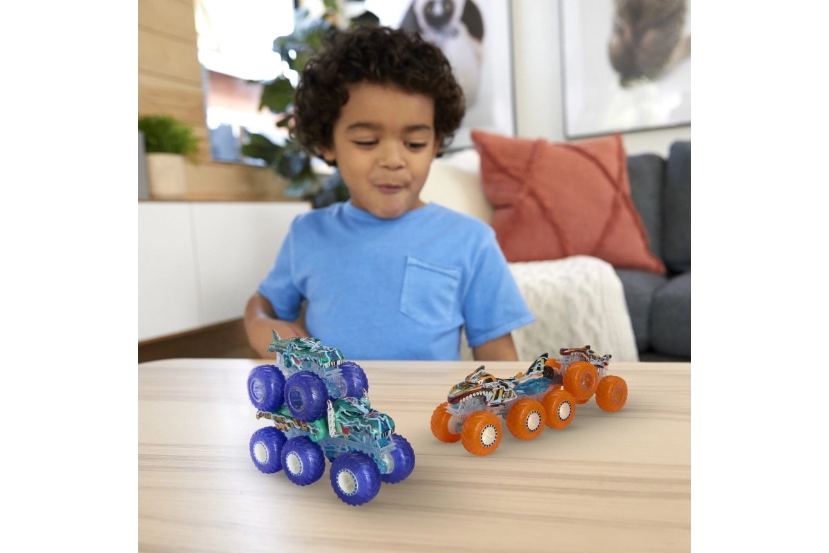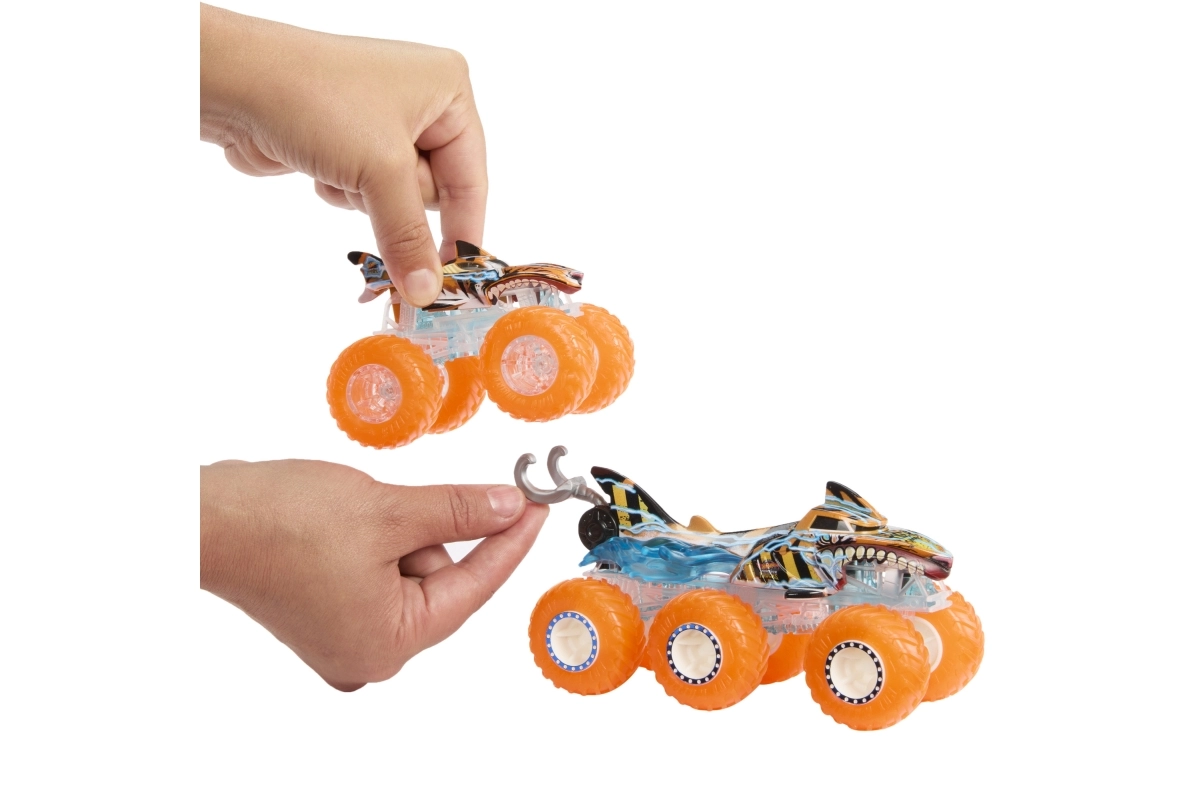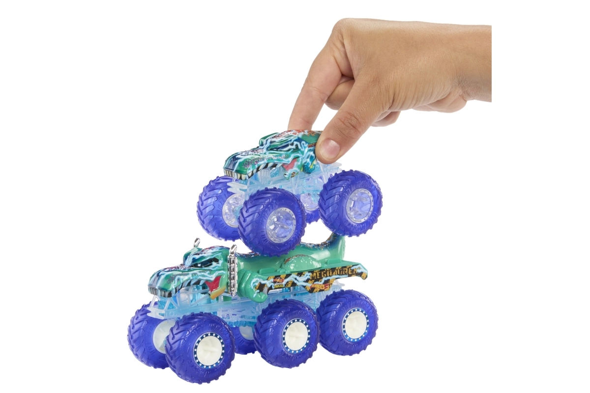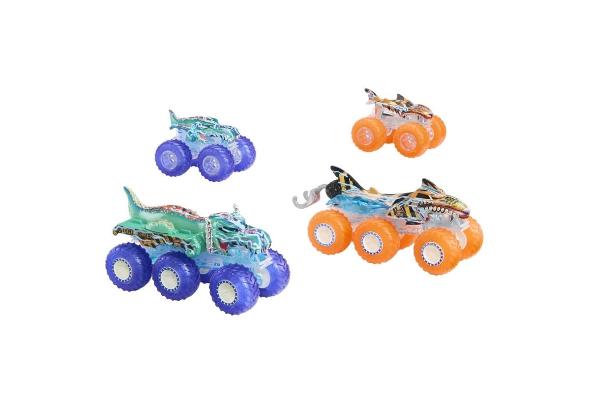 Komplektā ir populārie Tiger Shark un Mega-Wrex modeļi ar atbilstošām dekorācijām – ideāli Monster Trucks faniem.