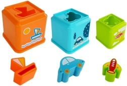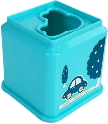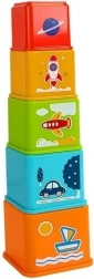 Krāsains kvadrātveida kausiņu komplekts ar transportlīdzekļu motīviem jautrai mācībai. Bērni trenē sīko motoriku, acu–roku koordināciju, loģisko domāšanu un krāsu, formu un skaitļu atpazīšanu. Katram kausiņam ir šķirošanas atvere (šķirotājs) pareizā transportlīdzekļa pievienošanai un tas ļauj būvēt augstu piramīdu.