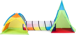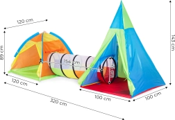 Izveidojiet bērniem viņu pašu piedzīvojumu pasauli. Spēļu komplekts iglu + tipi + tunelis piedāvā daudzveidīgu izkārtojumu spēlēm mājās un ārā. Katra daļa lietojama atsevišķi vai savienojama vienā lielā rotaļu trasē. Elpojošais sietaudums tunelī nodrošina ventilāciju un lielisku pārredzamību vasaras rotaļās.