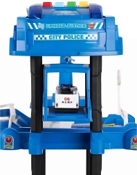 Liels policijas stāvvietas komplekts ar pieciem līmeņiem un helikoptera nosēšanās laukumu sniedz stundām ilgu radošu spēli. Komplektā ietilpst 2 automašīnas un helikopters, kustīgs lifts, gaismas un skaņas efekti, barjeras, zīmes un pilsētas spēļu paklājs. Drošs dizains bez asām malām, piemērots no 3 gadiem, lieliski attīsta iztēli un sīko motoriku.