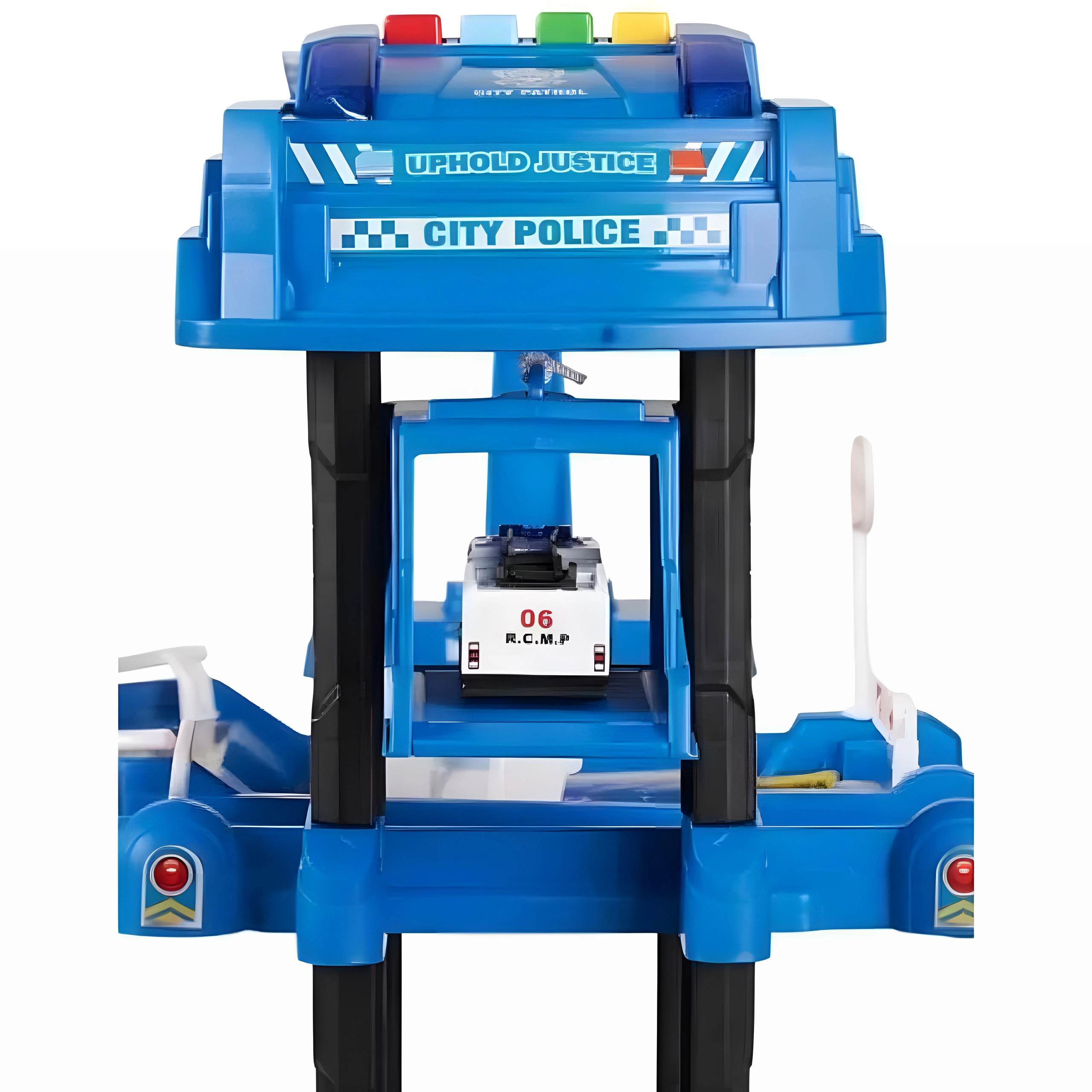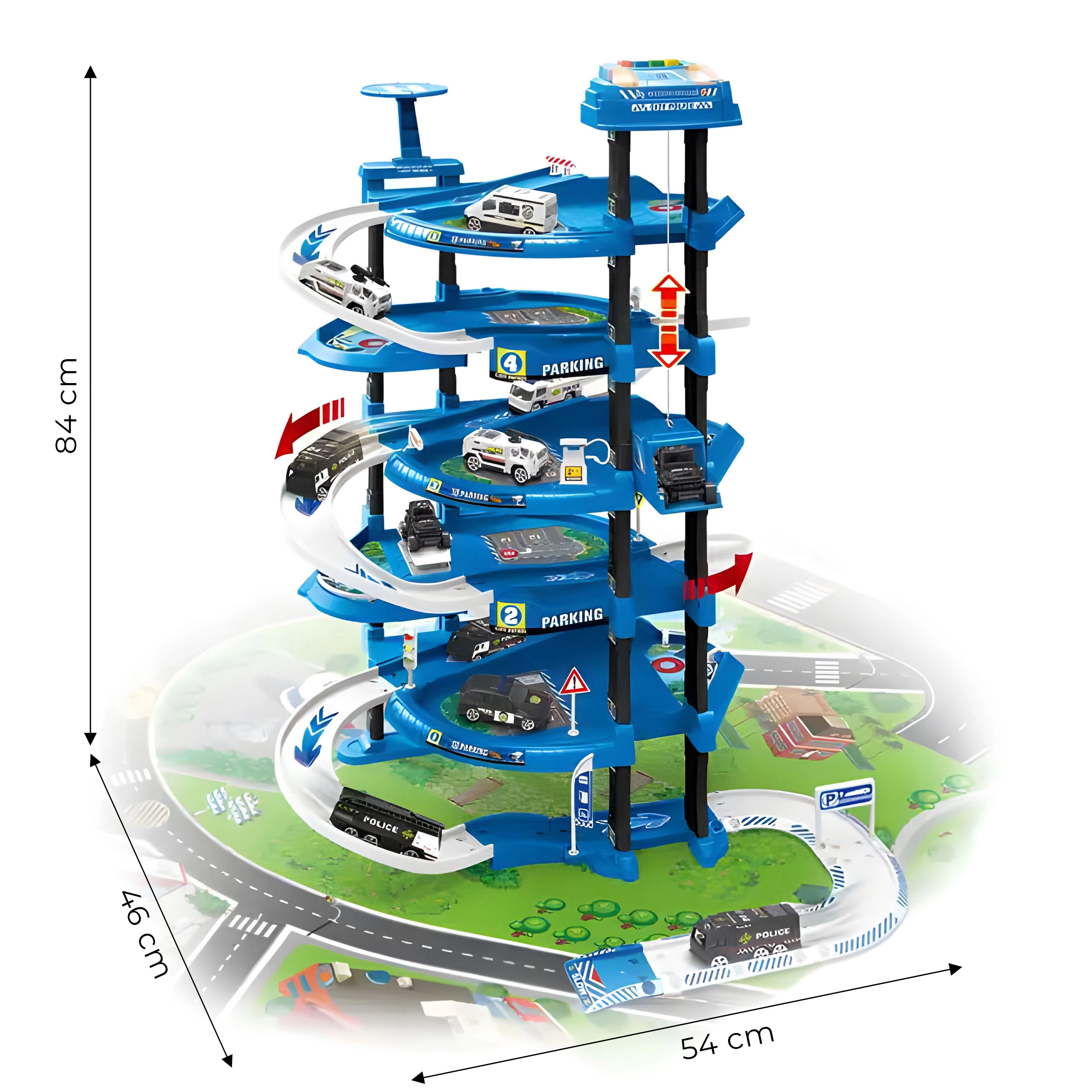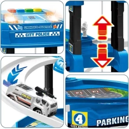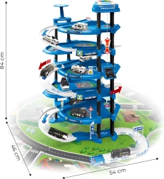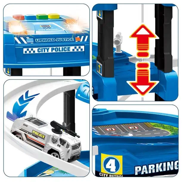 Atklājiet piecu stāvu stāvvietas garāžu ar policijas staciju, kas iepriecinās ikvienu mazo autovadītāju. Pateicoties reālistiskām detaļām, piemēram, rampām, barjerām, zīmēm un heliportam uz jumta, bērni var veidot savus stāstus un sižetus. Interaktīvais lifts nogādā automašīnas līdz pašai virsotnei, kur tās gaida jauni piedzīvojumi.