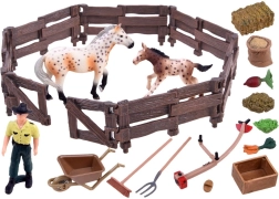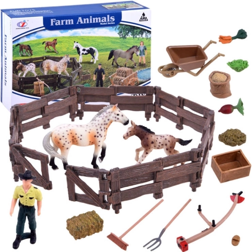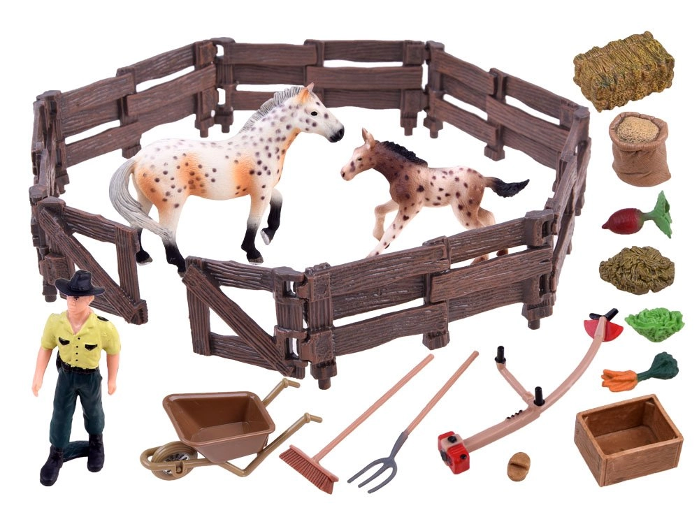 Šis bagātīgi aprīkotais komplekts bērnus aizvedīs uz saimniecības pasauli. Tajā atradīsiet divas reālistiskas zirgu figūriņas (ķēvi un kumeli), lauksaimnieku, sētu un daudz piederumu, piemēram, ķerra, dakšas, grābeklis, sile un barība. Realistiskās detaļas, sākot ar žoga “koka” tekstūru un beidzot ar zirgu krāsojumu, rosina iztēli un nodrošina ilgas spēles stundas.