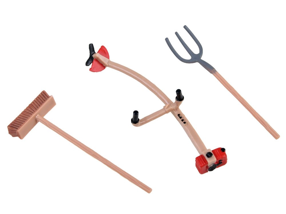 Lauksaimnieka figūriņa, ķerra, grābeklis, dakšas un citi piederumi īstenai saimniecības darbībai.