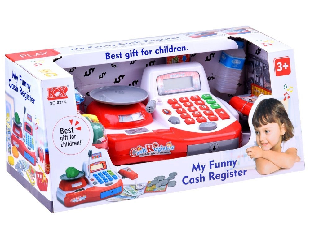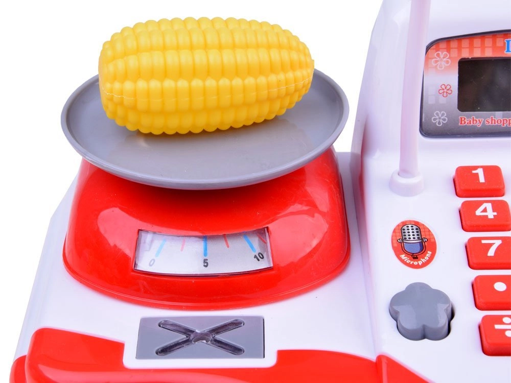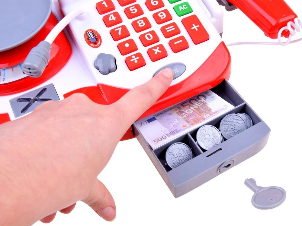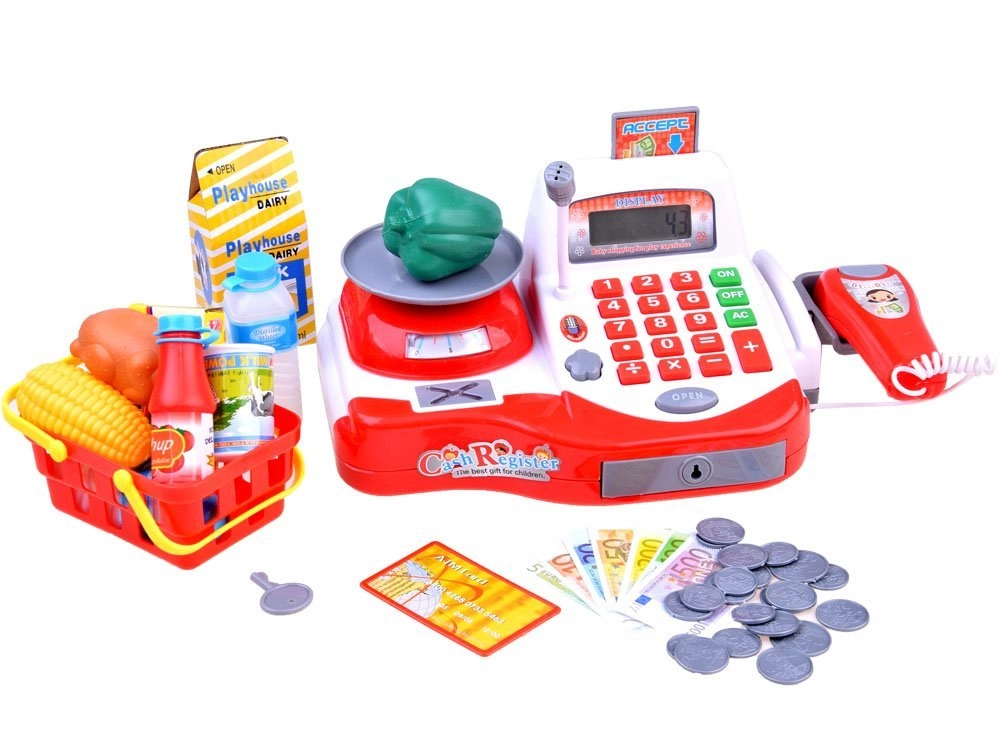 Šis bērnu kases aparāts piedāvā visu, kas mazajam pārdevējam nepieciešams: funkcionālu kalkulatoru pamataprēķiniem, skeneri ar gaismu un skaņu, preču svarus un mikrofonu paziņojumu izziņošanai. Naudas atvilktne atveras ar pogu “open” un to var aizslēgt. Pateicoties bagātīgajam piederumu komplektam, bērni viegli atdarina īstu iepirkšanos.