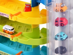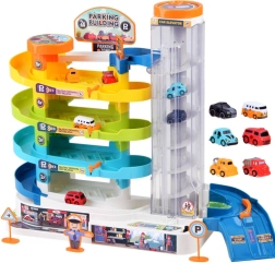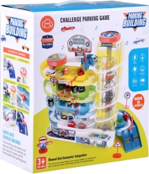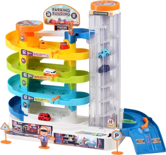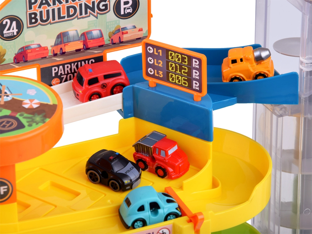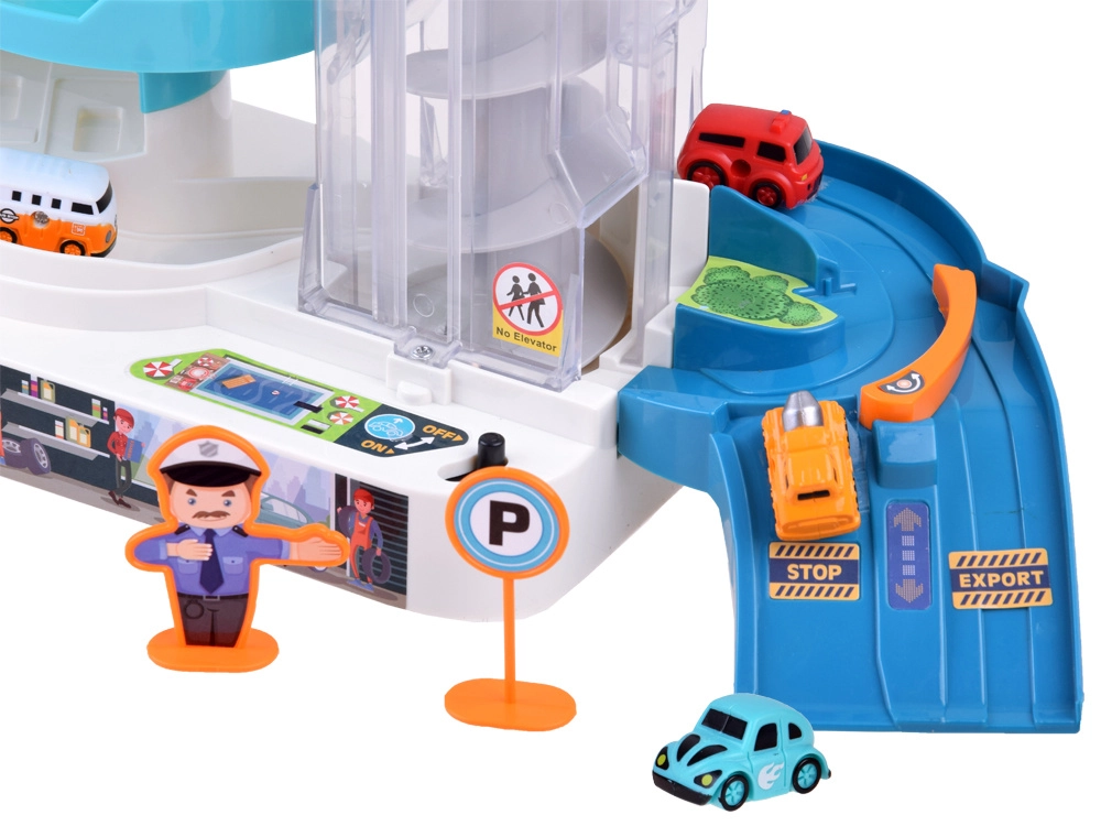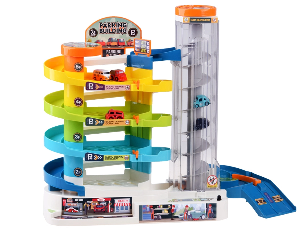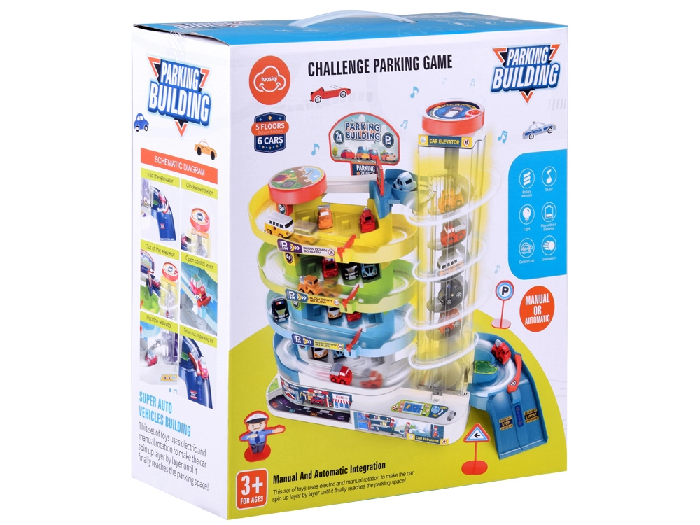 Šī krāsainā plastmasas stāvvietas garāža ar četriem stāviem bērniem sniedz daudz aizraujošu brīžu: auto var braukt pa spirālveida rampām un ar caurspīdīgā lifta palīdzību pārvietoties starp stāviem. Liftu var darbināt manuāli vai elektriski, izmantojot 3× AA baterijas (nav iekļautas). Darbojoties liftam, iedegas gaismiņas un skan jautra mūzika.