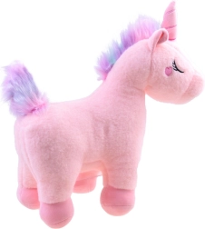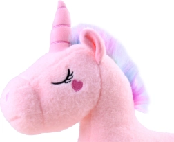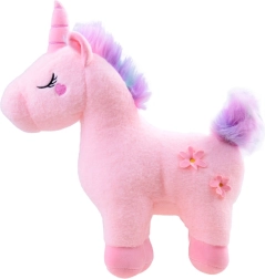 Mīlīgs plīša vienradzis pasteļtoņos ir ideāls draugs mīļošanai un rotaļām. Tam ir mīksts ķermenis, izšūtas acis, sirsniņa uz vaidziņa un ziediņi uz sāna. Maiga varavīksnes krāsas krēpe un aste piešķir maģisku izskatu, bet patīkamais materiāls ir kā radīts bērnu apskāvieniem.