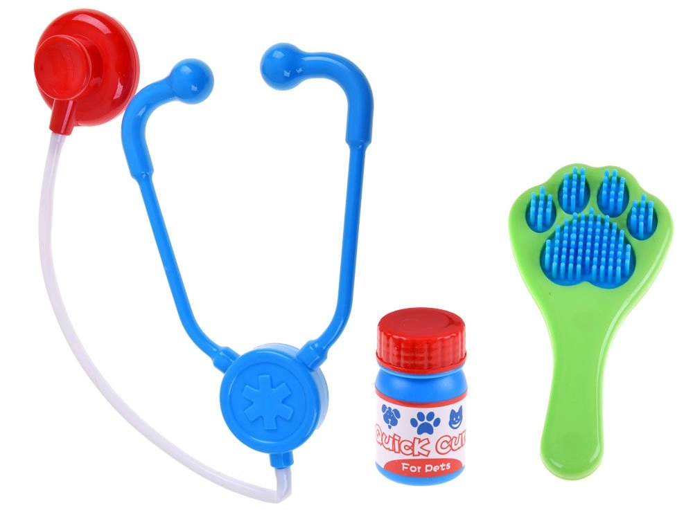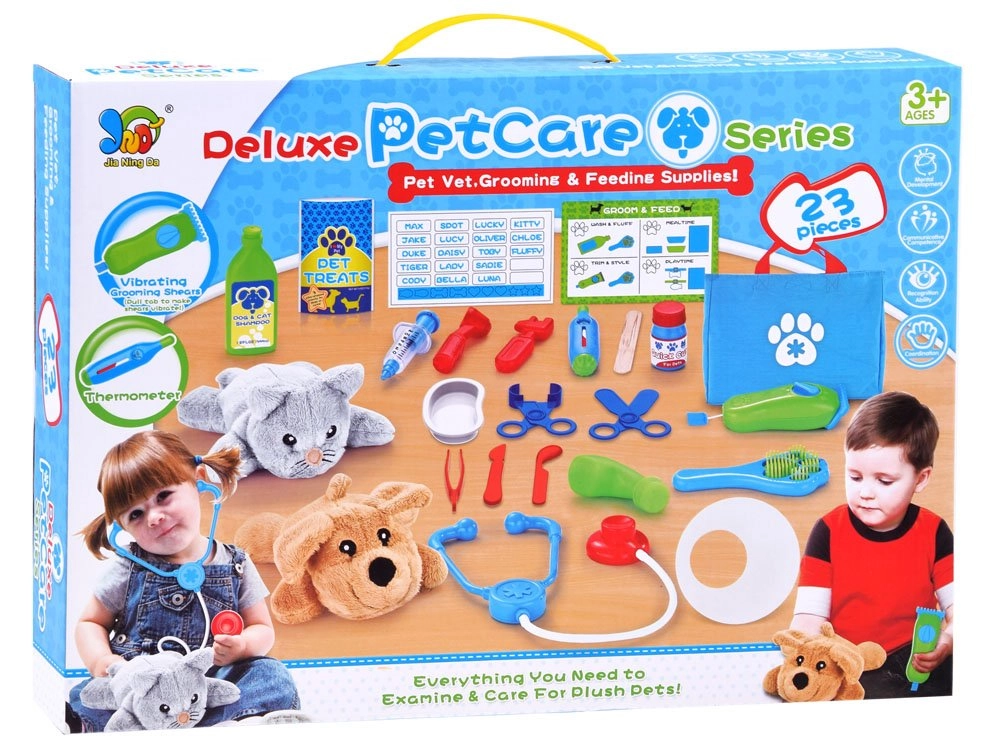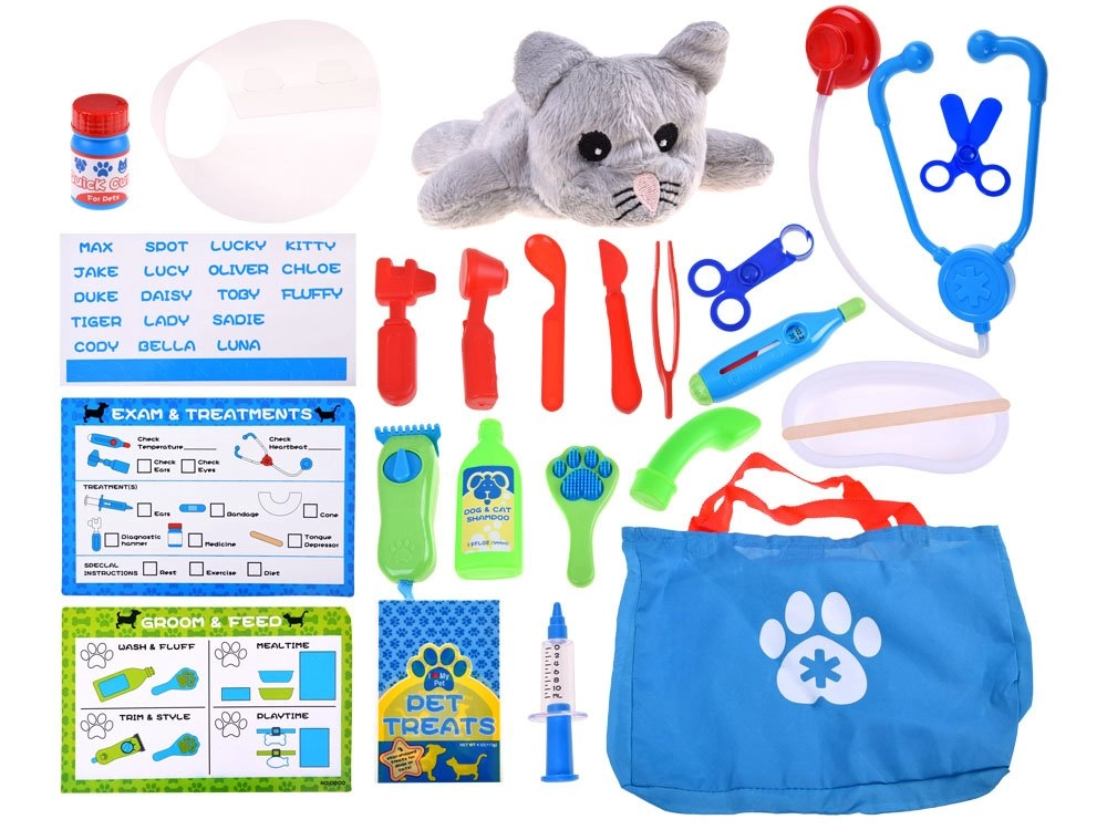 Izglītojošs veterinārās aprūpes komplekts bērniem piedāvā visu, kas mazajam veterinārārstam nepieciešams, lai aprūpētu mīksto dzīvnieciņu pacientus, piemēram, kaķus un suņus. Ar 23 dažādiem priekšmetiem šis komplekts ir ideāls radošuma un mācīšanās veicināšanai rotaļas veidā. Visi instrumenti ir izgatavoti no kvalitatīvas plastmasas, kas nodrošina to drošību un izturību.