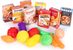 Komplektā ir augļi, dārzeņi, olas, gaļas izstrādājumi un pārtikas kastītes – ideāli šķirošanai, iepirkšanās atdarināšanai un mājsaimniecības pamatu apguvei.