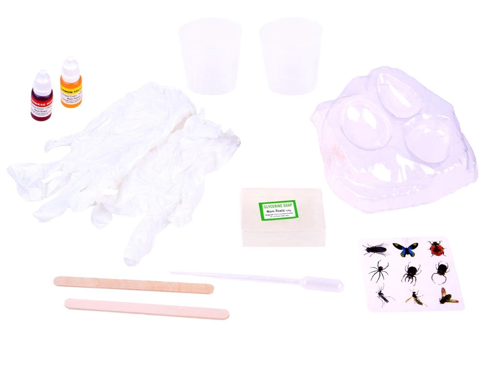 Iekļauts viss nepieciešamais dzintara izgatavošanai, tostarp ziepju bāzes, krāsas un formas.
