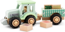 Šajā skaistajā komplektā ietilpst maigi zaļš traktors, noņemama piekabe un četri koka kluči ar tomātu, baklažāna, burkāna un brokoļa apdrukām. Bērni var kraut, pārvadāt un izkraut dārzeņus, trenēt roku-acu koordināciju un iepazīt saimniecības pasauli.