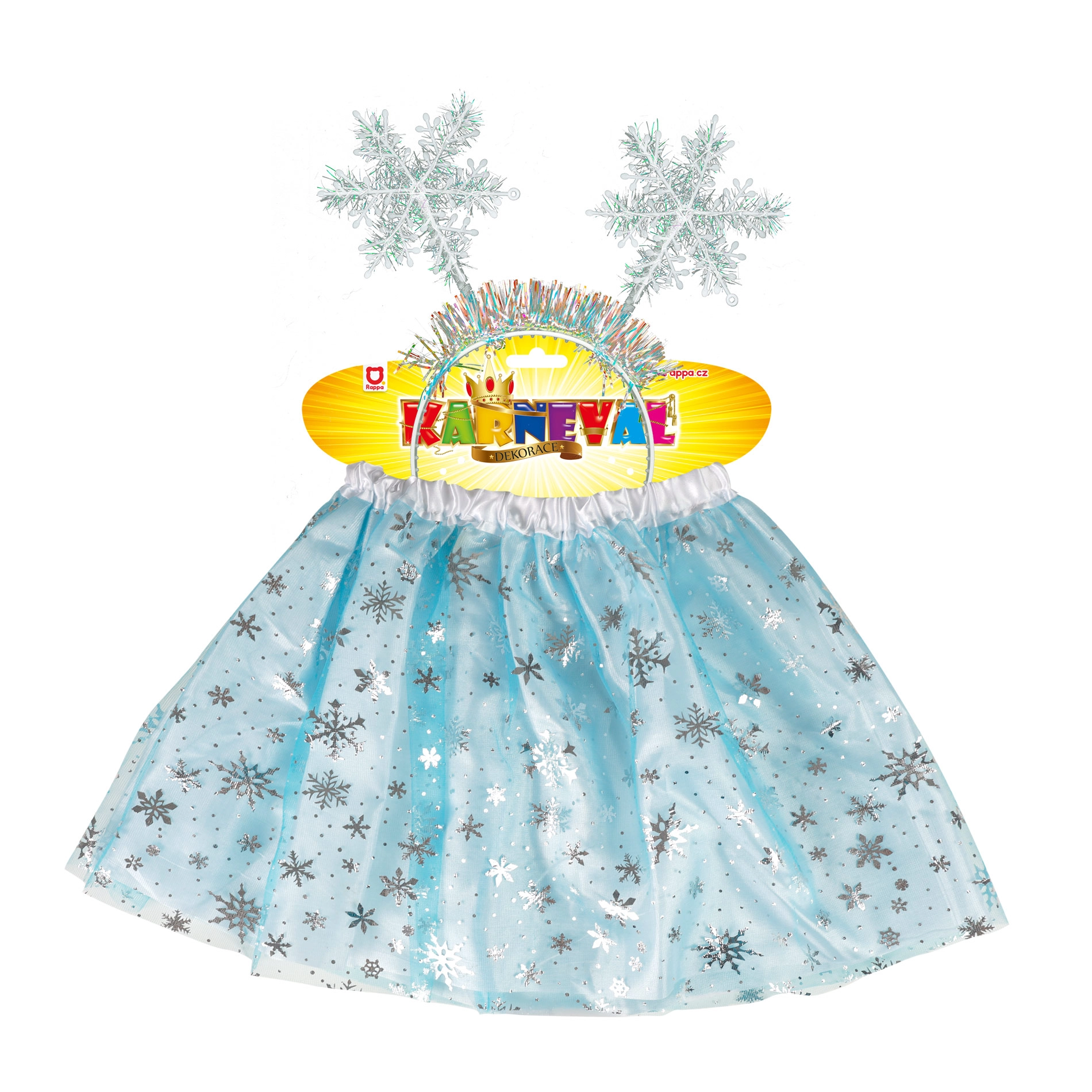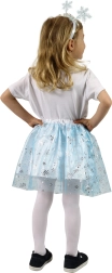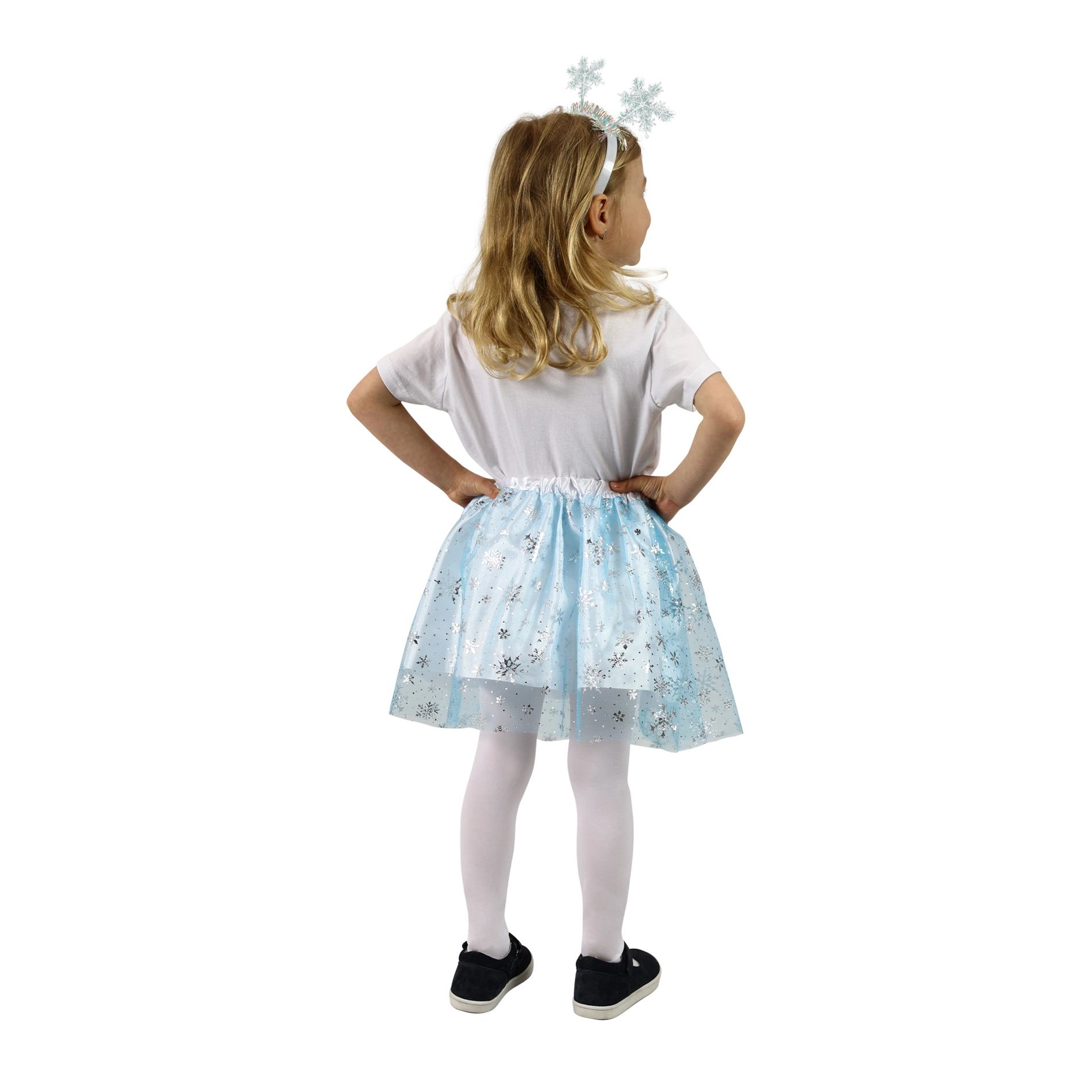 Zila svārku daļa ar mirdzošām sniegpārsliņām un satīna jostu piešķir ziemas burvību.