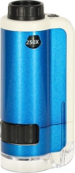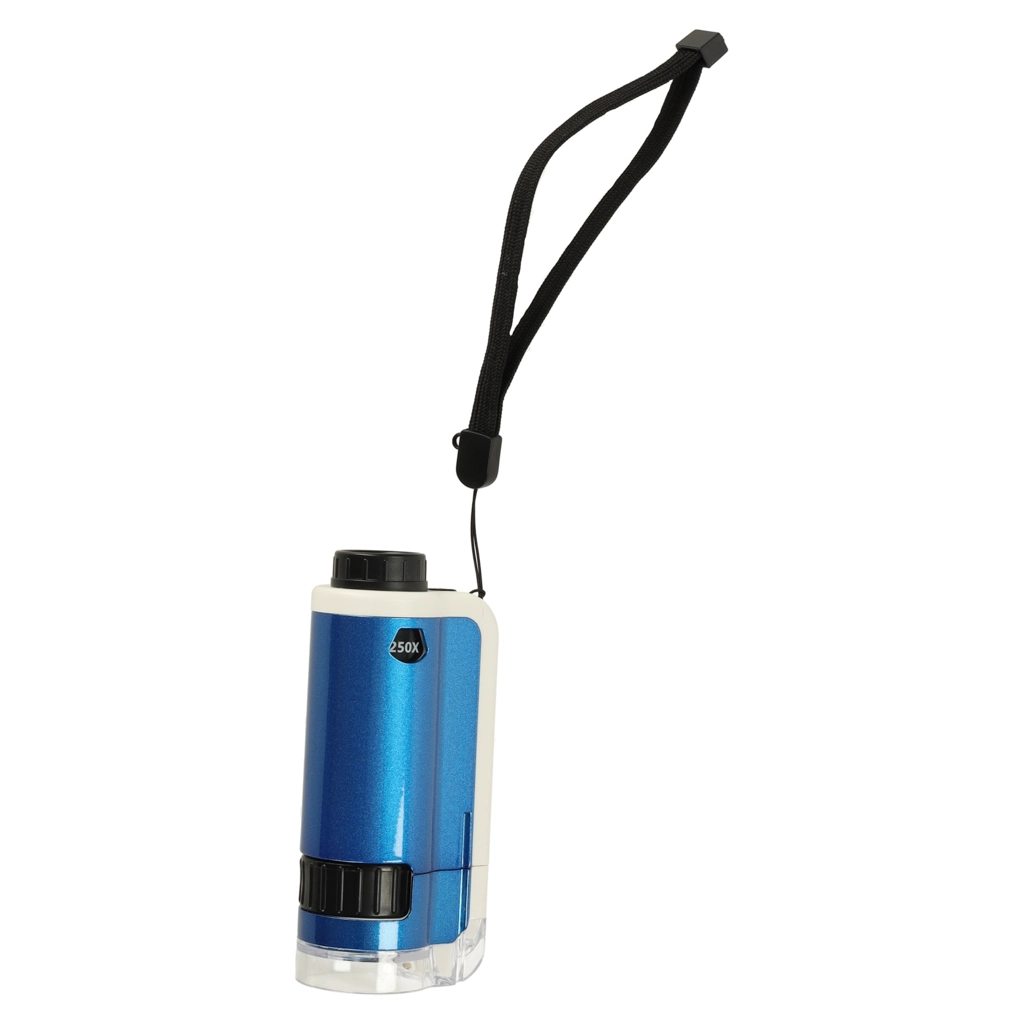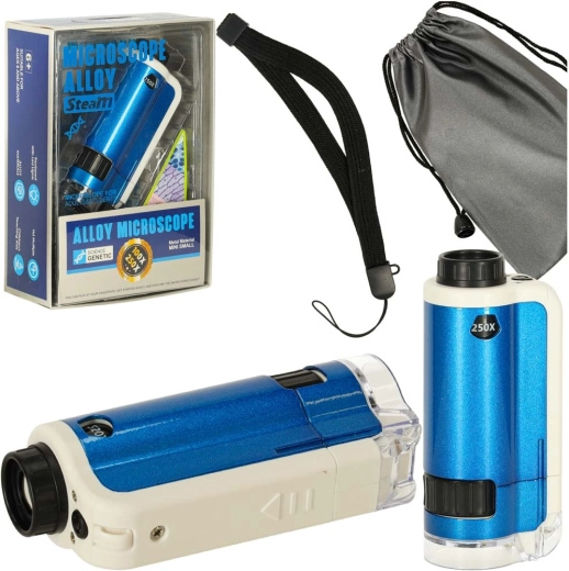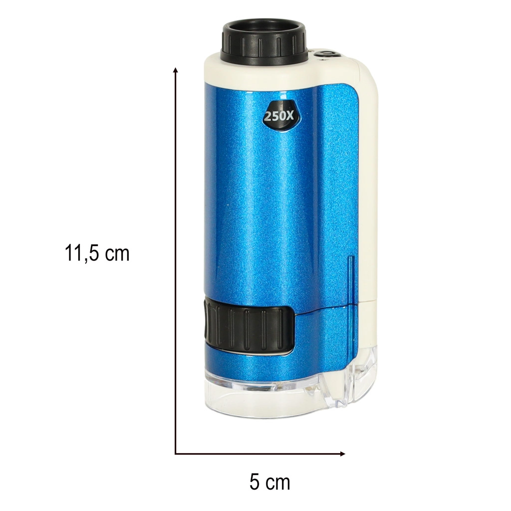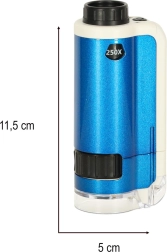 Atklājiet fascinējošo mikroskopisko pasauli ar kabatas mikroskopu bērniem. Šī ierīce ļauj detalizēti izpētīt dažādus objektus, piemēram, lapas, tekstila šķiedras vai sāls kristālus, pateicoties divkāršam palielinājumam (100x, 250x). Mikroskops ir aprīkots ar LED diodi, kas nodrošina optimālu apgaismojumu.