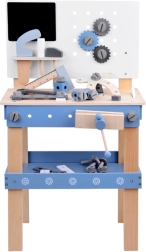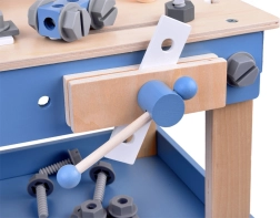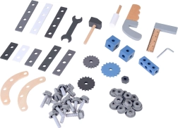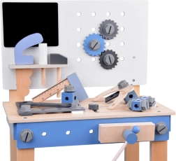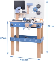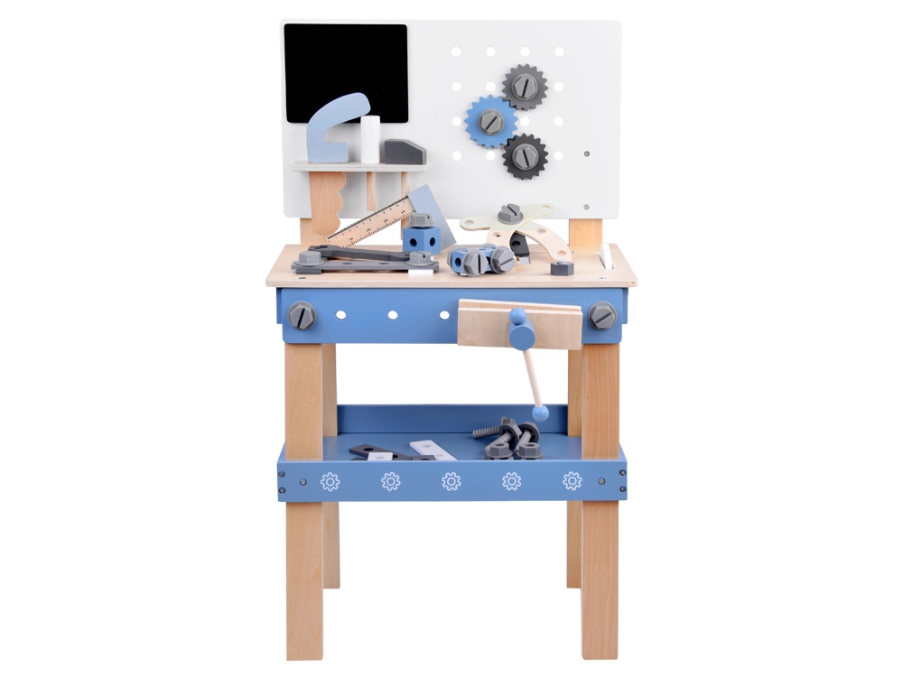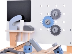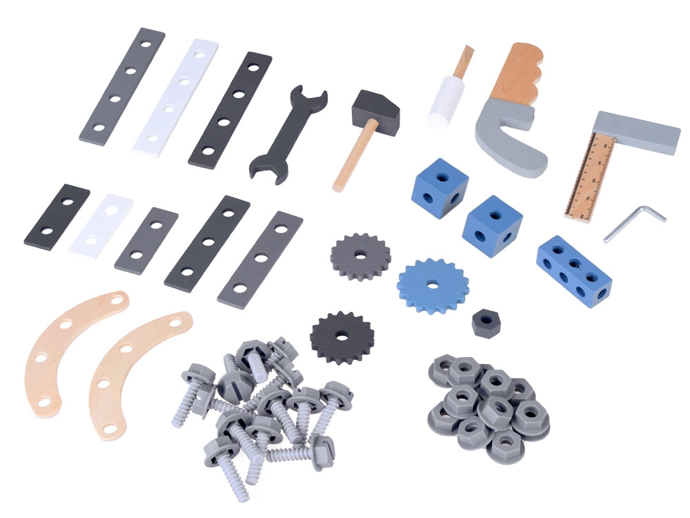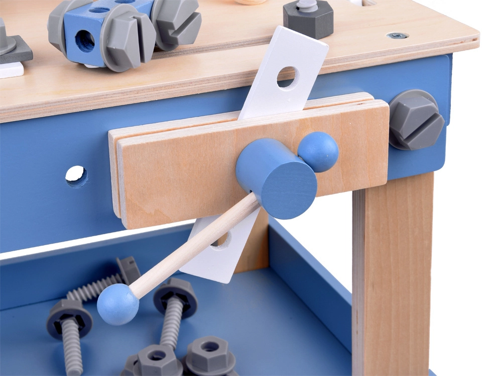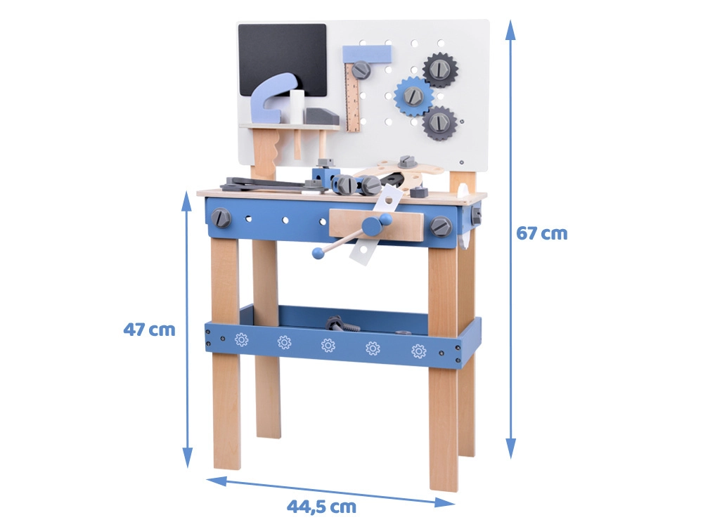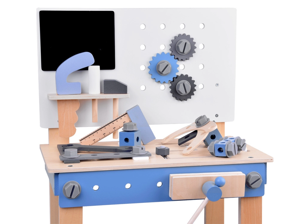Šis koka bērnu darbagalds ir izstrādāts, lai attīstītu veiklību, koordināciju un loģisko domāšanu. Daudzveidīgais piederumu komplekts – no skrūvēm, uzgriežņiem un savilcējlīstēm līdz zobratiem, lineālam, vicei, āmuram un skrūvgriezim – ļauj bērniem skrūvēt, mērīt, piestiprināt un eksperimentēt ar pārnesumiem.