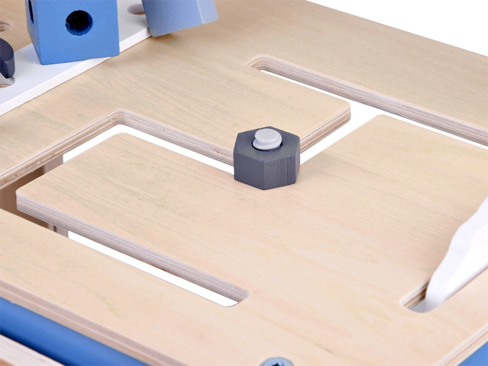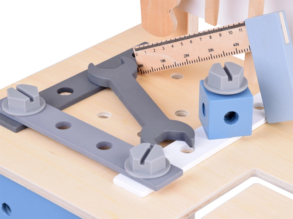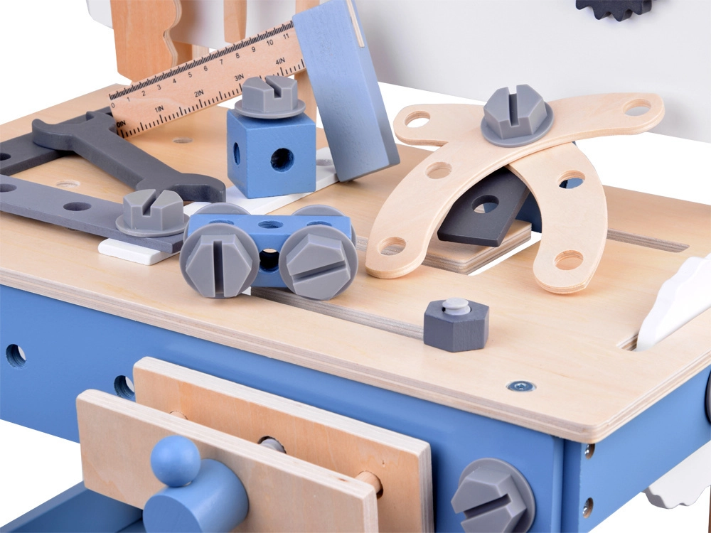 Drošība pirmajā vietā: visas detaļas ir gludi slīpētas, ar noapaļotām malām un netoksiskām krāsām. Integrēta mērlīnija uz galda virsmas māca bērniem darba organizāciju un mērīšanas pamatus, kamēr perforētā plāksne un rotējošie zobrati aicina uz fantāzijas spēlēm.