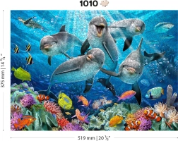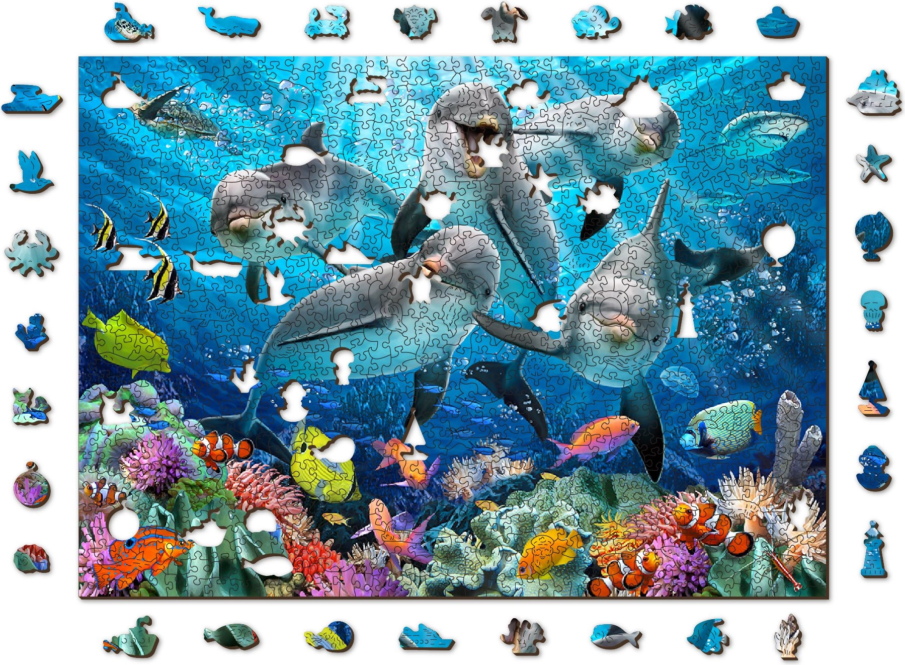 Izbaudiet unikālu pužļa pieredzi ar jautru delfīnu motīvu. Pateicoties speciāli veidotiem gabaliņiem, no kuriem daļa ir dzīvnieku formā un var kalpot arī kā mazas figūriņas, iegūsiet neierastu likšanu, pilnu pārsteigumu. Precīza lāzera apstrāde nodrošina asus motīva sīkumus un pilnīgi gludas malas bez skabargām.
