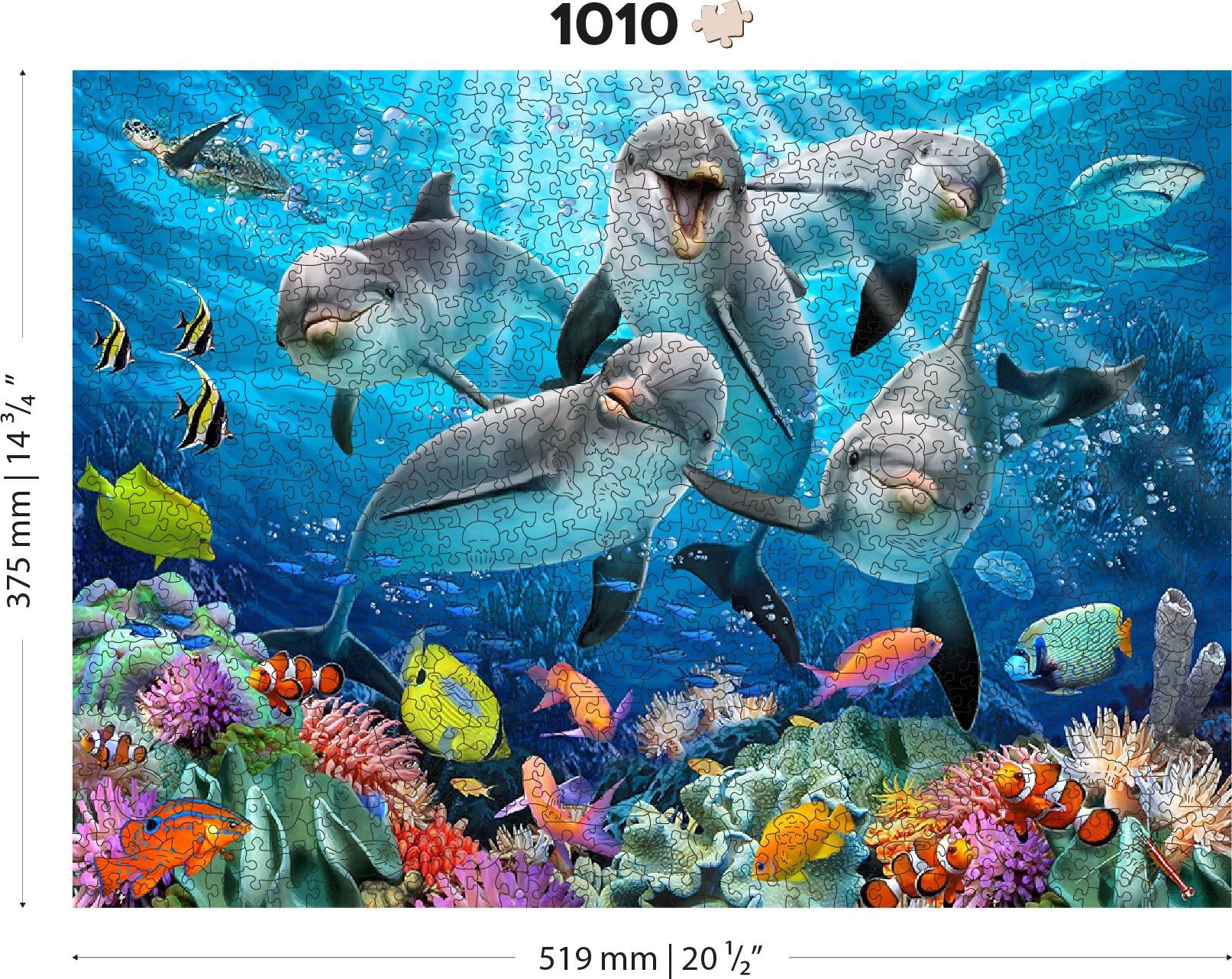 Atklājiet pužļu likšanas burvību ar koka puzli WOODEN CITY Laimīgie delfīni ar 1010 lāzergrieztiem gabaliņiem. Oriģināli dzīvnieku formas gabaliņi ar smalkām lāzera detaļām rada pievilcīgu izaicinājumu un izklaidi daudzu stundu garumā. Puzle ir eko-friendly, bez plastmasas iepakojuma, no kvalitatīvas HDF plātnes un ar gludām, precīzām malām ērtai likšanai.