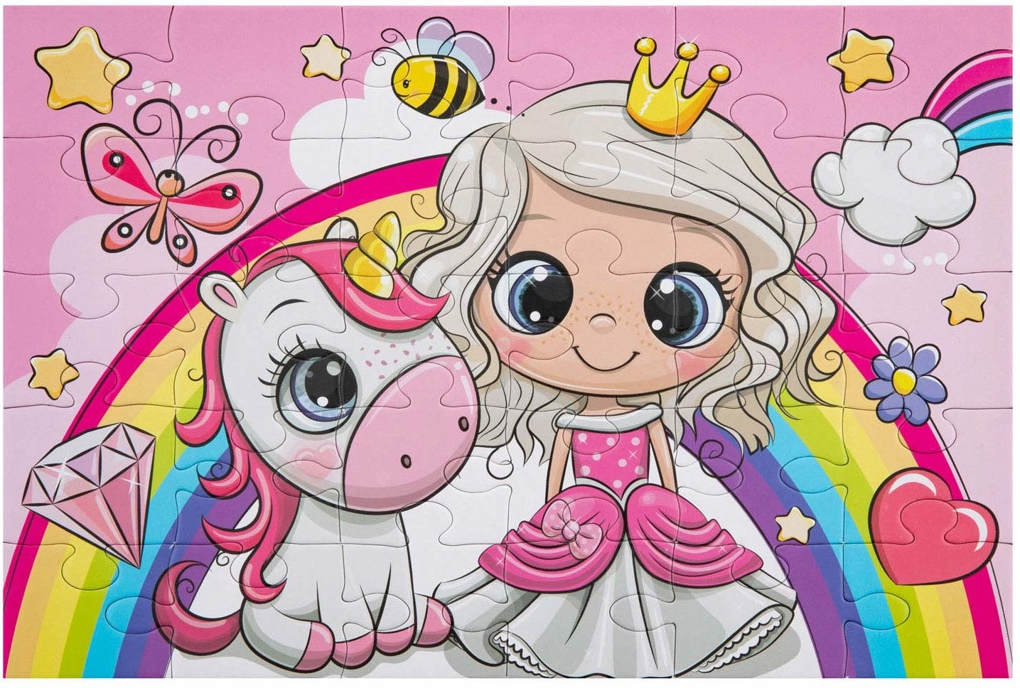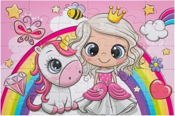Skaists bērnu puzlis ar princeses un vienradža motīvu iepriecinās mazos liktņus. Satur 30 lielus gabaliņus, pēc salikšanas izveidojas attēls ar izmēru 29 × 18 cm. Puzlis ir iepakots elegantā dāvanu kastītē ar rokturi – lieliski kā dāvana un ceļojumiem.