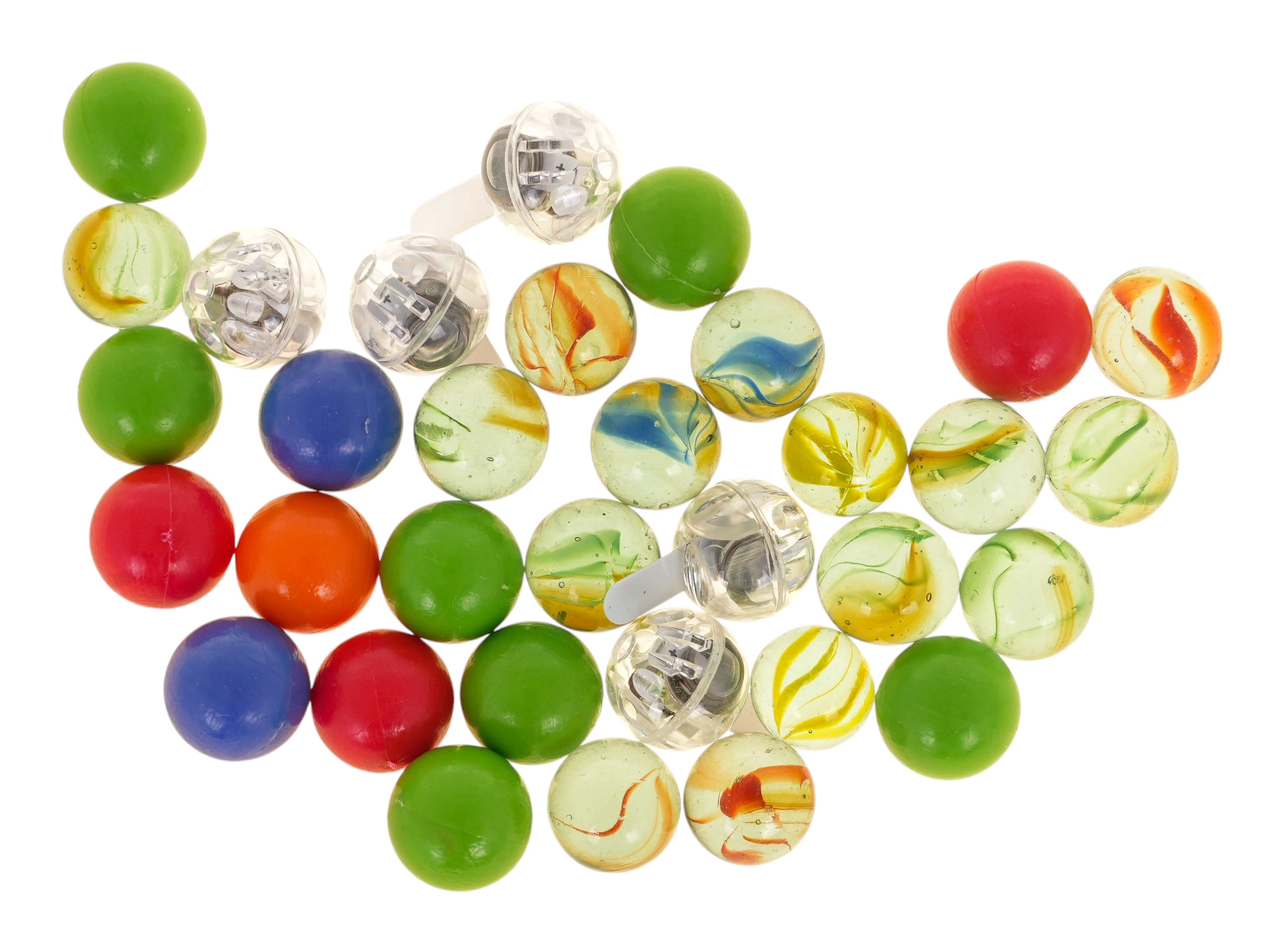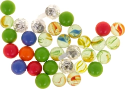 Komplektā ir 33 bumbiņas, no kurām 5 mirgo ar krāsainām LED gaismām. Gaismas efekti iedvesmo izmēģināt jaunas trases un pagarina spēles laiku.