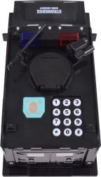 Banknotes pietiek pielikt pie atveres – mehānisms tās pats ievilks iekšā. Monētas iemet caur augšējo atveri, kas paslēpta zem jumta vāciņa.