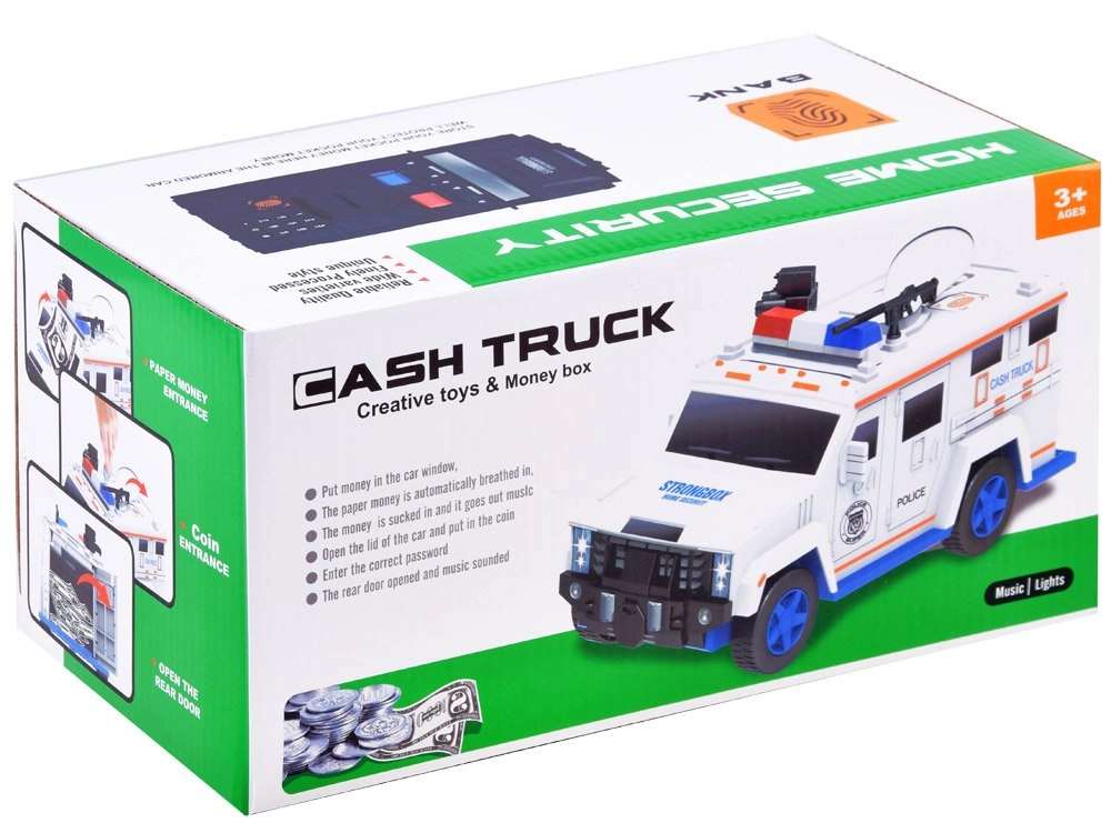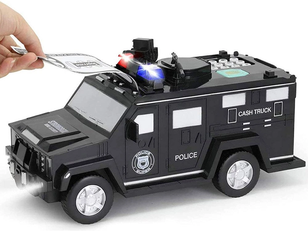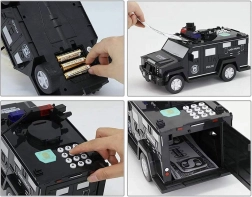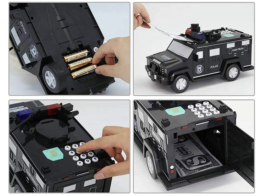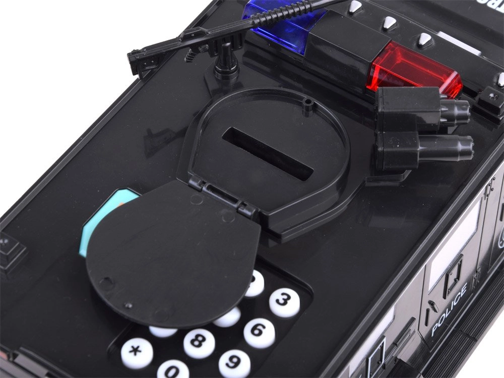 Šī interaktīvā krājkase policijas auto formā sargā bērna uzkrājumus un vienlaikus izklaidē. Bērni var ievadīt drošības kodu (noklusējuma 0000), apstiprināt to ar pieskārienu pirkstu nospiedumu skenerim (simulācija) un atvērt seifa durvis. Banknotes automātiski tiek ievilktas caur priekšējo atveri, monētas iemet caur augšējo atveri zem vāciņa.