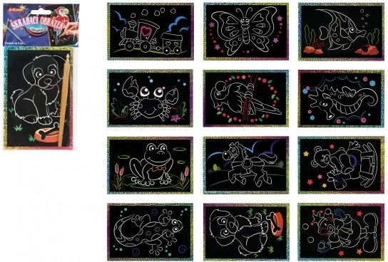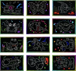Šis skrāpējamo attēlu komplekts ir ideāla izvēle pirmajai radošajai nodarbei. Vienkāršo pilna motīva noberšanas principu bez sarežģītām detaļām bērni viegli sapratīs un uzreiz redzēs rezultātu: skaistus mirdzošus un krāsainus attēlus, kas efektīgi spīd.