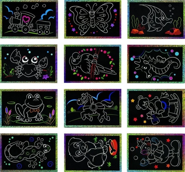 Atklājiet radošu izklaidi pašiem mazākajiem: komplekts ar mirdzošiem skrāpējamiem attēliem izmērā 15 × 10 cm. Tā vietā, lai skrāpētu smalkas līnijas, tiek noņemts viss attēls – līdzīgi kā noberžamā loterijas biļete – un rodas krāsaini, spīdīgi motīvi, kas piemēroti bērniem no 3 gadu vecuma.