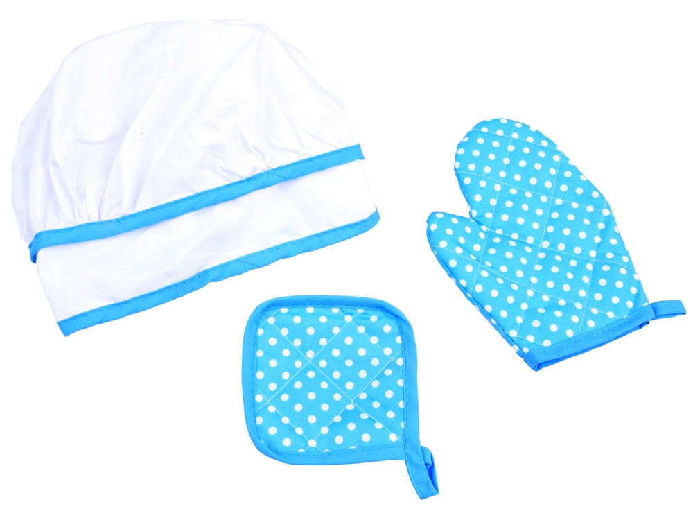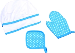 Cepure ar gumiju, priekšauts ar kabatu un termocimds ar paliktni pasargā apģērbu un rokas, un bērni jūtas kā īsti pavāri.