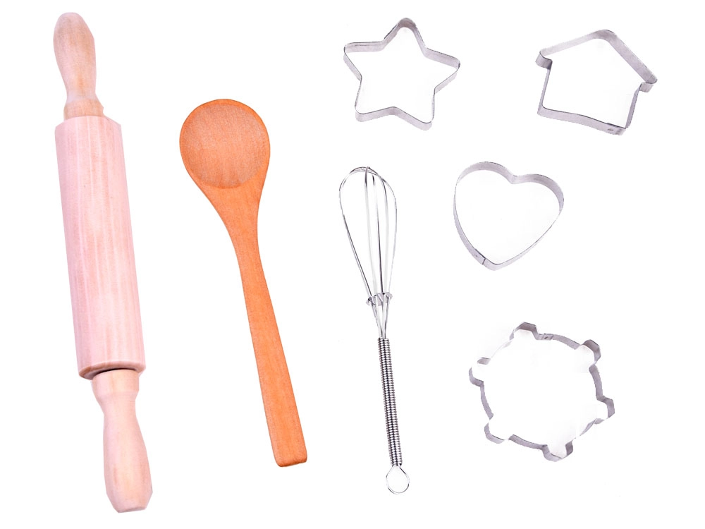 Koka mīklas rullis un karote, metāla putojamā slotiņa un 4 metāla cepumu formiņas (sirds, zvaigzne, zieds u.c.) mīklas veidošanai un sagatavošanai.