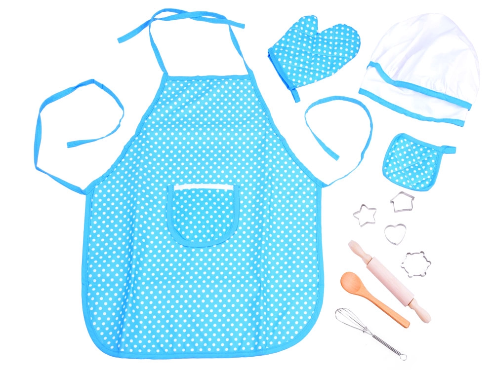 Priekšauts, cepure, cimds, paliktnis un cepšanas rīki vienā iepakojumā – viss, kas bērnam vajadzīgs rotaļīgai un arī īstai gatavošanai.