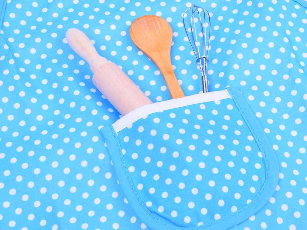 - Priekšauts, pavāra cepure, cimds, tekstila paliktnis, koka mīklas rullis, koka karote, metāla putojamā slotiņa, 4 metāla cepumu formiņas