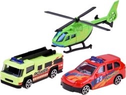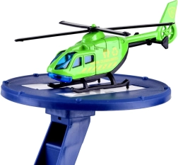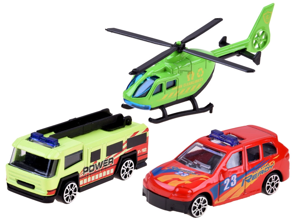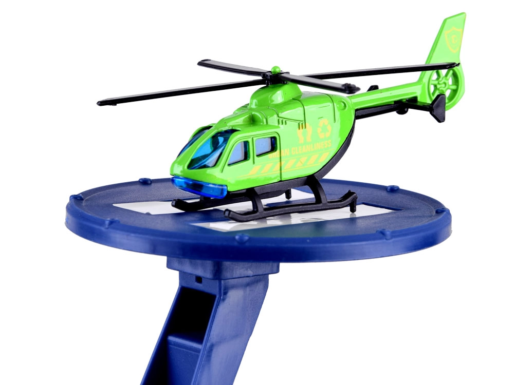- Pilns komplekts: 2 metāla mašīnītes, helikopters, 7 ceļa zīmes, uzlīmes, pilsētas paklājiņš.
