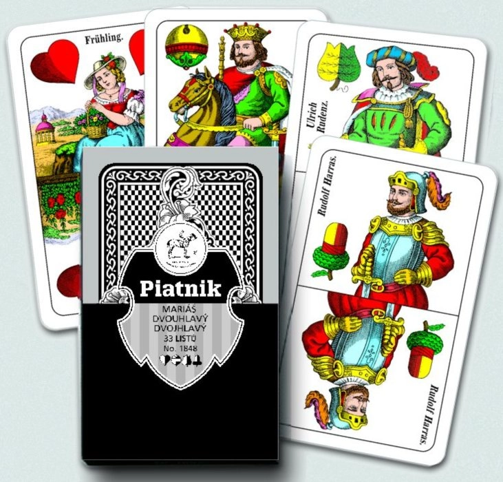 Atklājiet tradicionālās kāršu spēles šarmu ar kavu Piatnik Mariāšs - Divgalvīgās kārtis. Šī spēle ir populāra kāršu entuziastu vidū tās stratēģiskā dziļuma un vakara izklaides iespēju dēļ:
