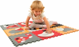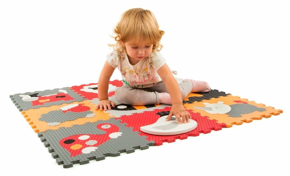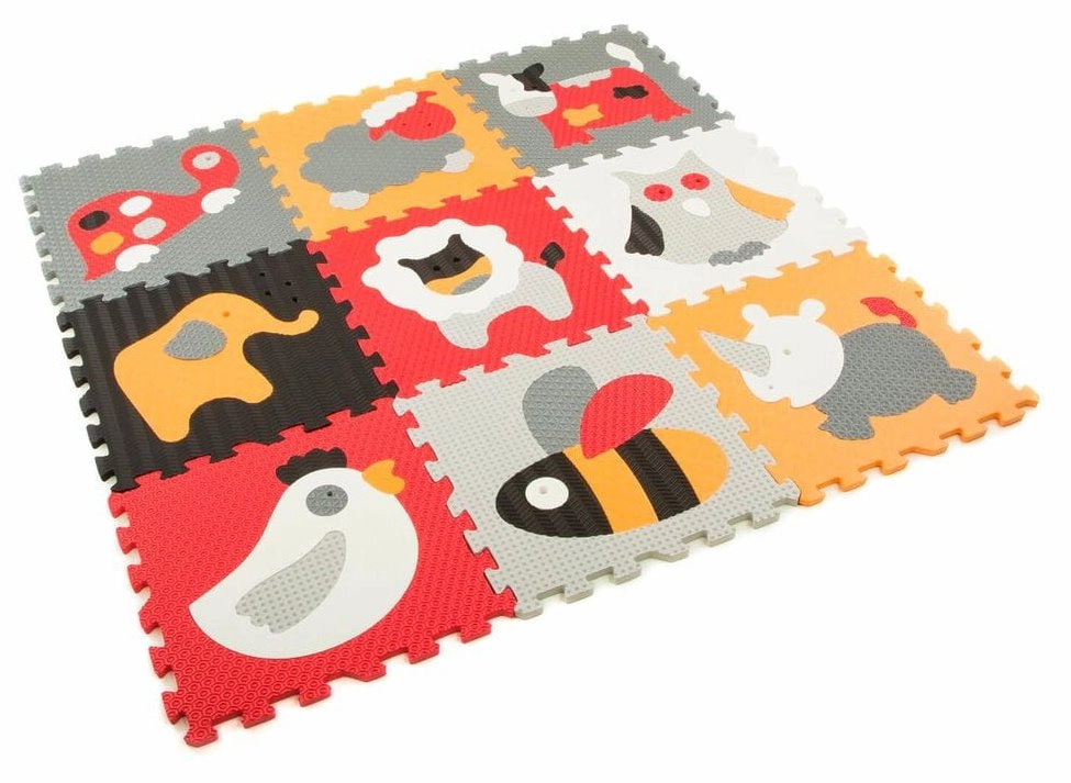 Putu puzles ar dzīvnieku motīviem pelēkā un sarkanā krāsu salikumā ir lieliska izvēle kā rotaļu paklājs bērnu istabai vai viesistabai. Atsevišķie attēli sastāv no piecām līdz astoņām izņemamām daļām, tāpēc bērni trenē smalko motoriku un loģisko domāšanu. Pamatne ir mīksta, droša, viegli kopjama un, pateicoties izolējošajām īpašībām, pasargā no aukstas grīdas.