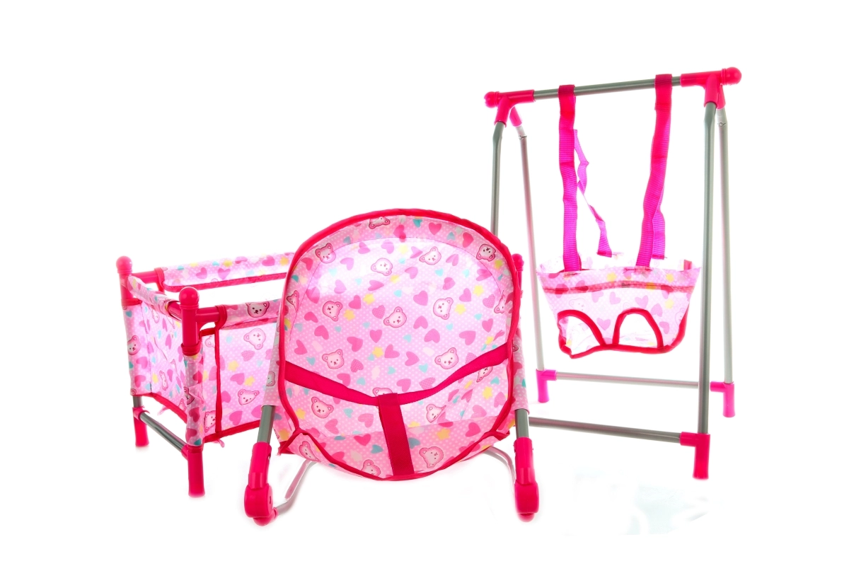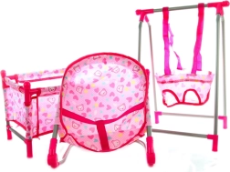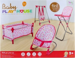 Leļļu komplekts 4-vienā ar gultiņu, šūpuli, atpūtas krēsliņu un barošanas krēsliņu