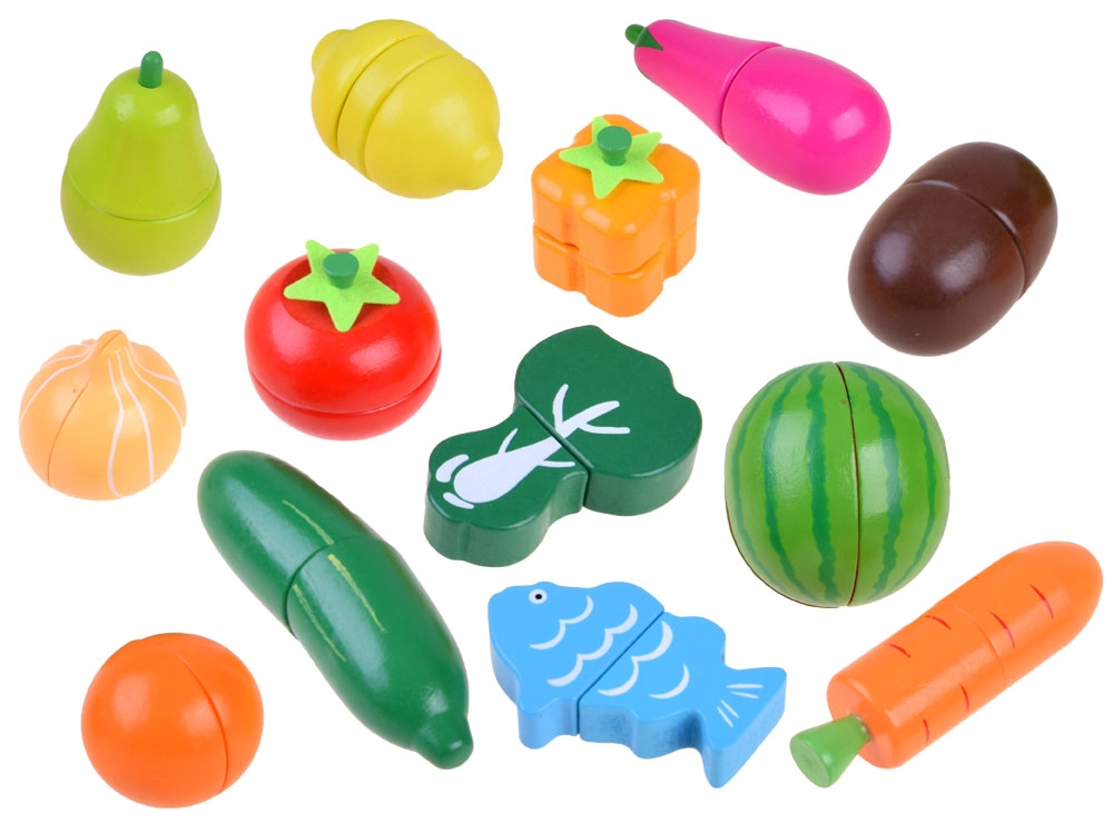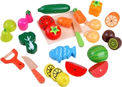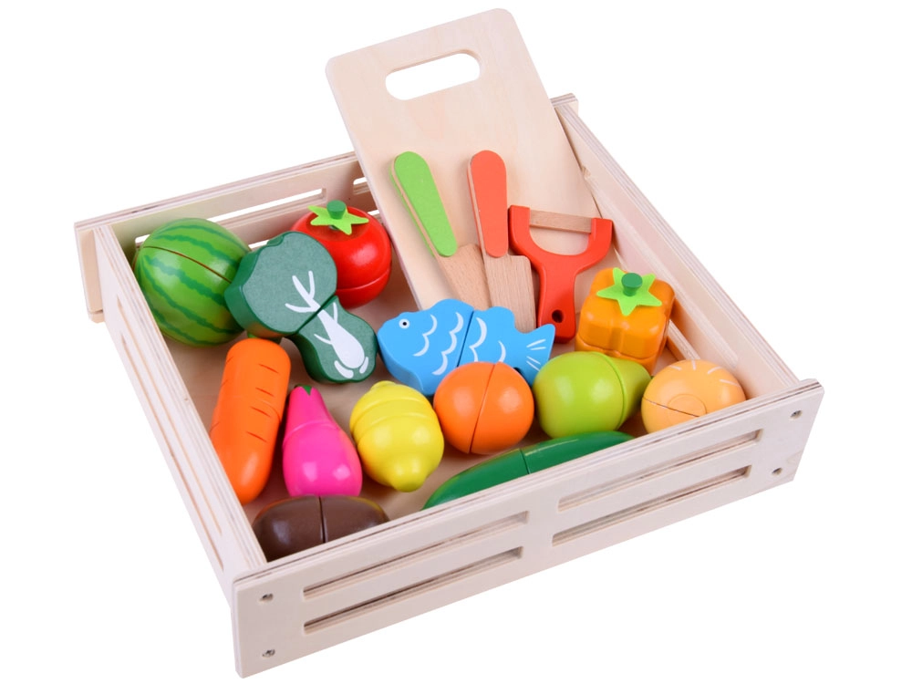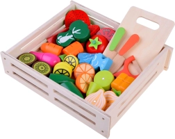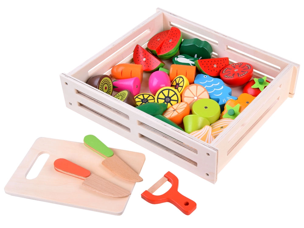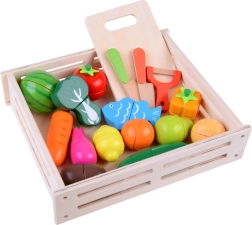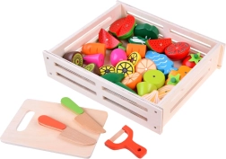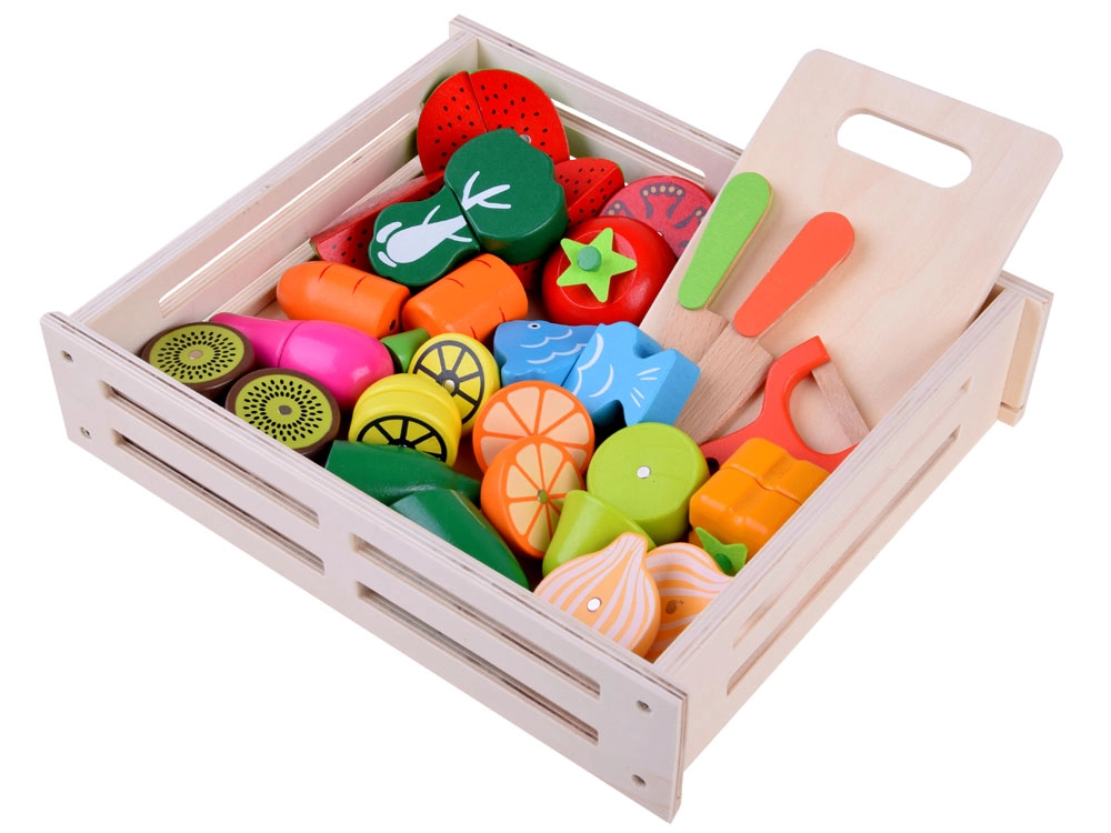 Iepakojuma saturs: Koka kastīte, griešanas dēlītis, divpusējs nazis, mizotājs, dažādi augļi un dārzeņi, piemēram, tomāts, burkāns, gurķis, paprika, zemenes, kivi un citi.
