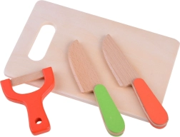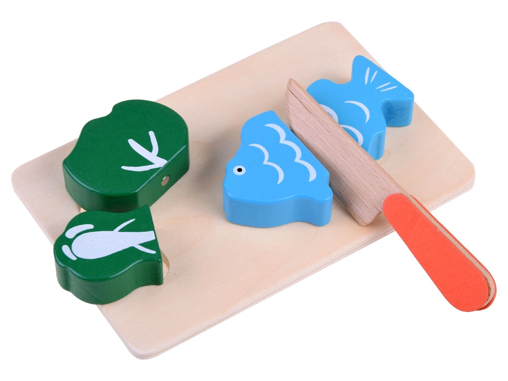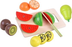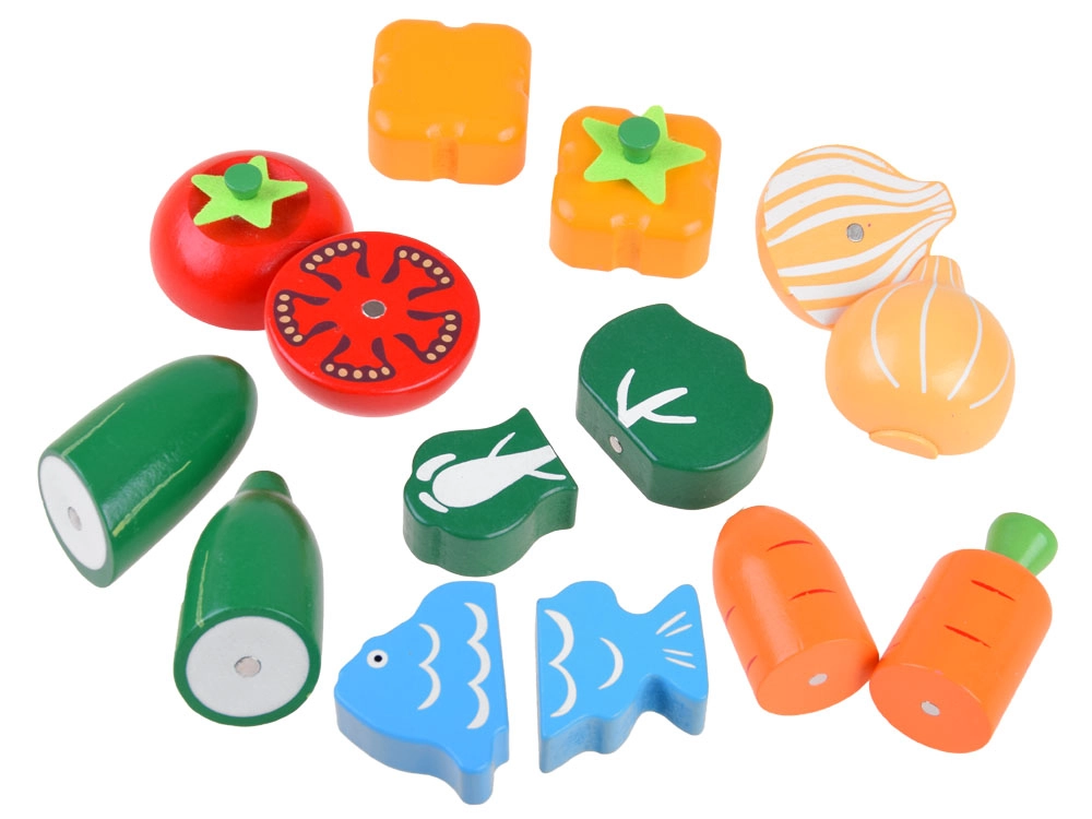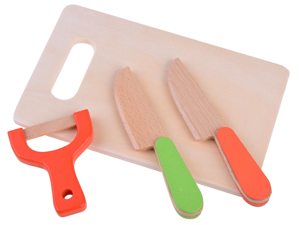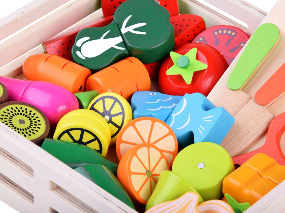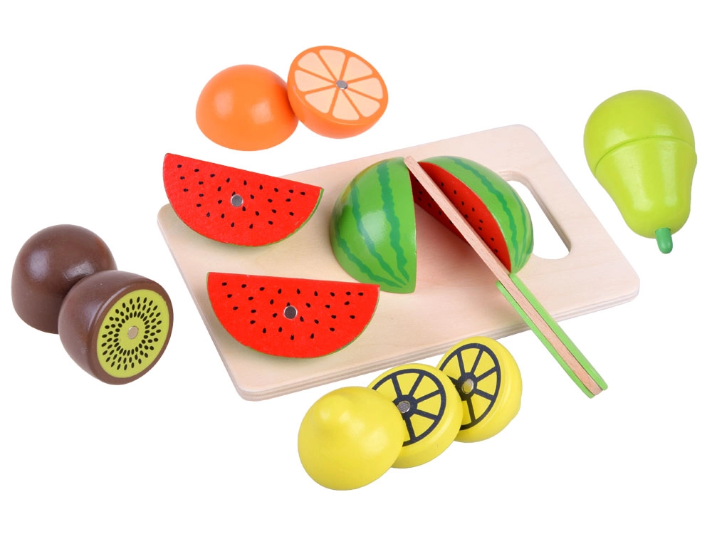 Iepakojuma saturs: Koka kastīte, griešanas dēlītis, divpusējs nazis, mizotājs, dažādi augļi un dārzeņi, piemēram, tomāts, burkāns, gurķis, paprika, zemenes, kivi un citi.