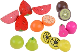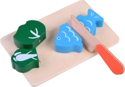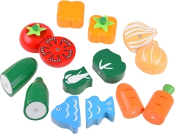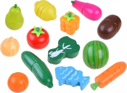 Šis koka komplekts ietver daudzveidīgu augļu, dārzeņu un zivju izlasi, viss aprīkots ar magnētiem ērtai sadalīšanai daļās. Katrā gabalā izmantota kvalitatīva koksne un netoksiskas krāsas, kas nodrošina drošību pašiem mazākajiem.