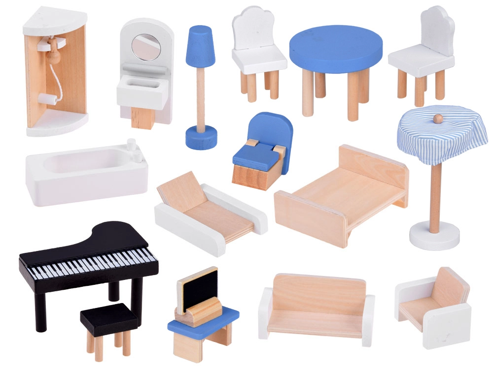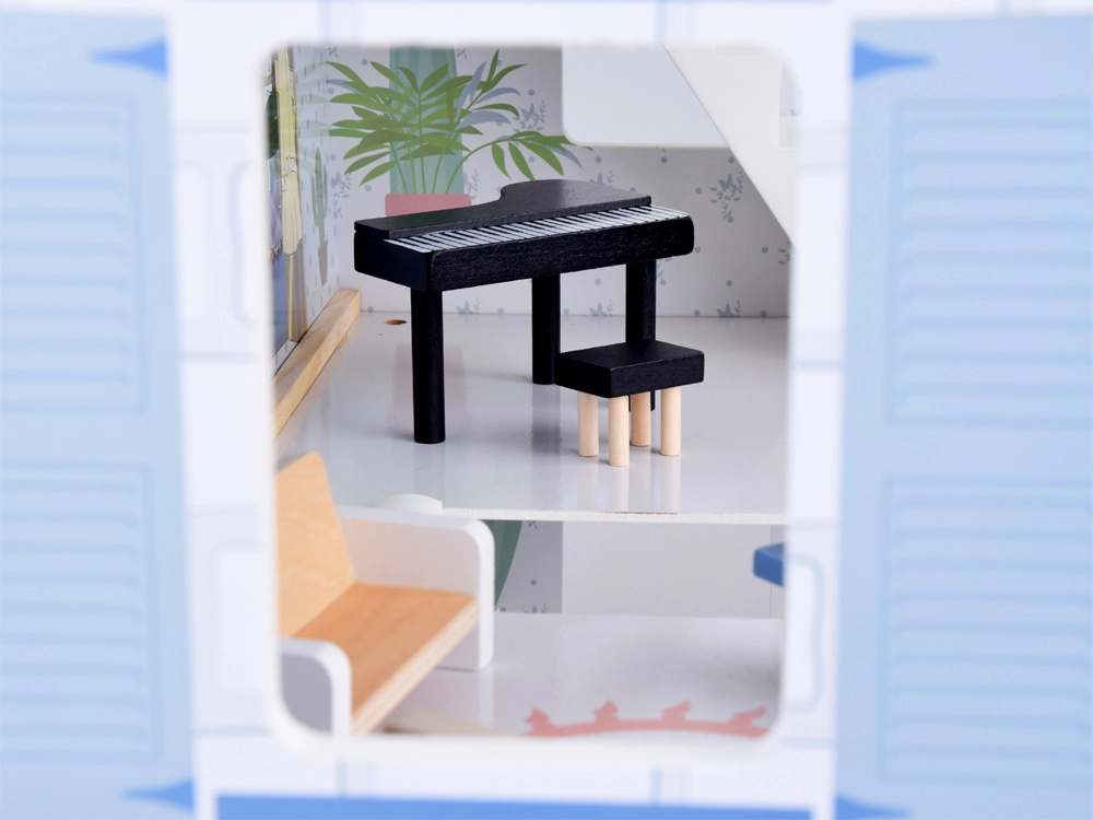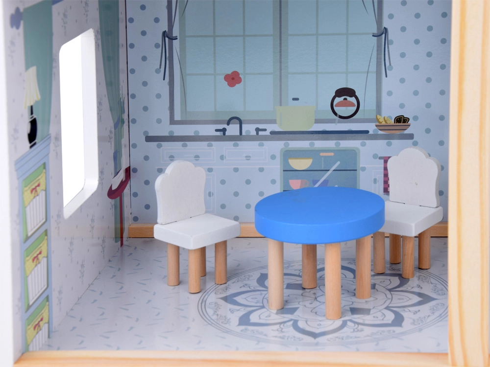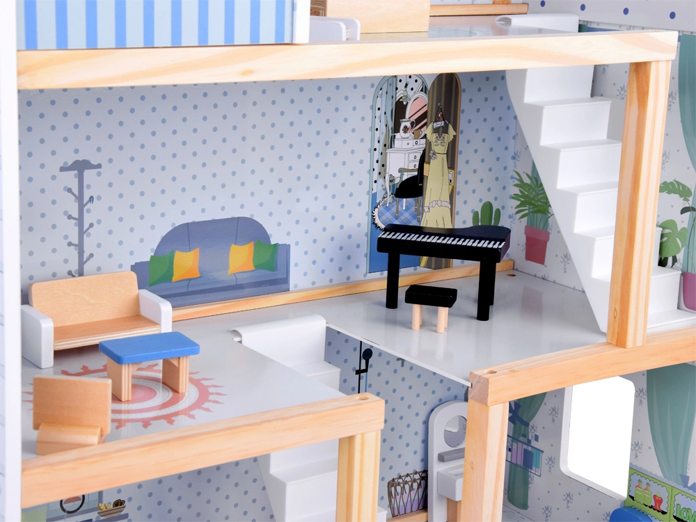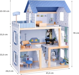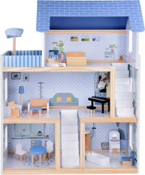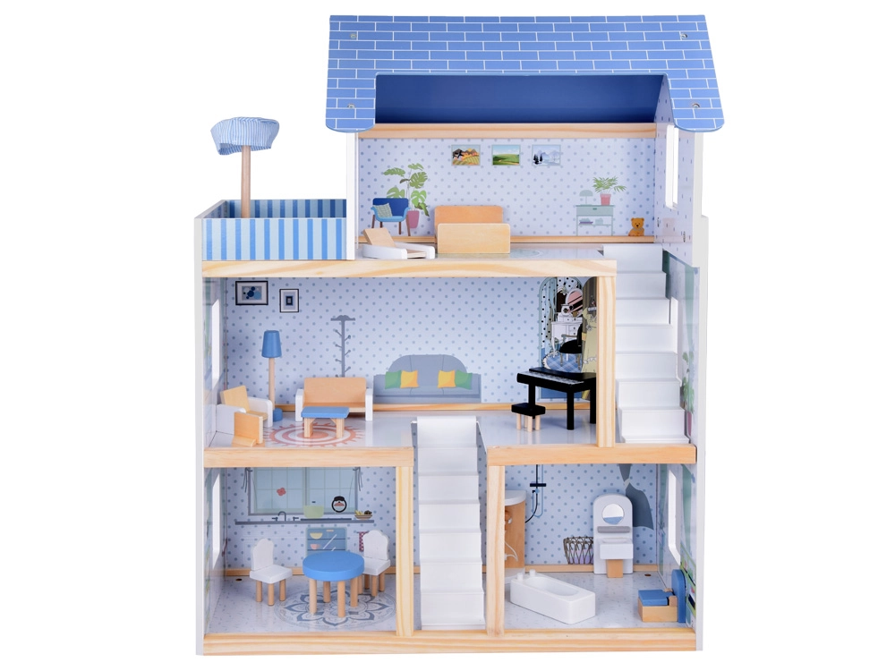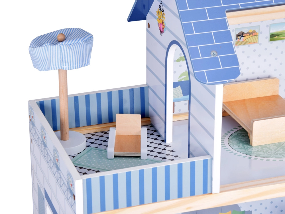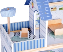 Komplektā iekļauti bagātīgi aksesuāri dabīgā koka, baltā un zilajos toņos. Reālistiskas detaļas, stabila konstrukcija un patīkami telpu izmēri veicina iztēli, sīko motoriku un patstāvīgu spēli. Māja lieliski izskatās arī no ārpuses, pateicoties slēģiem un dekoratīvajam jumtam.