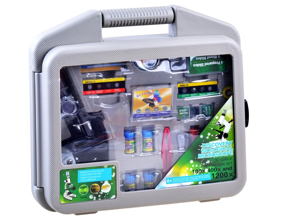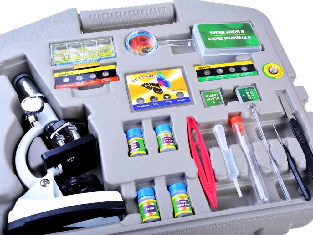 Komplektā ir visi pamatinstrumenti, kas nepieciešami bioloģisko paraugu vērošanai un apstrādei.