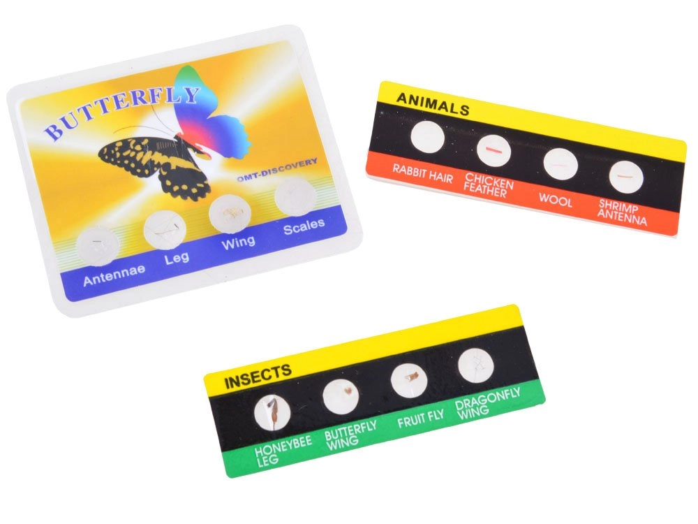 Pievienotajās mācību kartītēs ir dažādi paraugi, piemēram, kukaiņu taustekļi vai zaķa spalvas, praktiskai mācīšanai un izpētei.