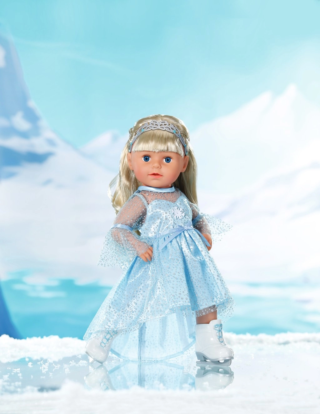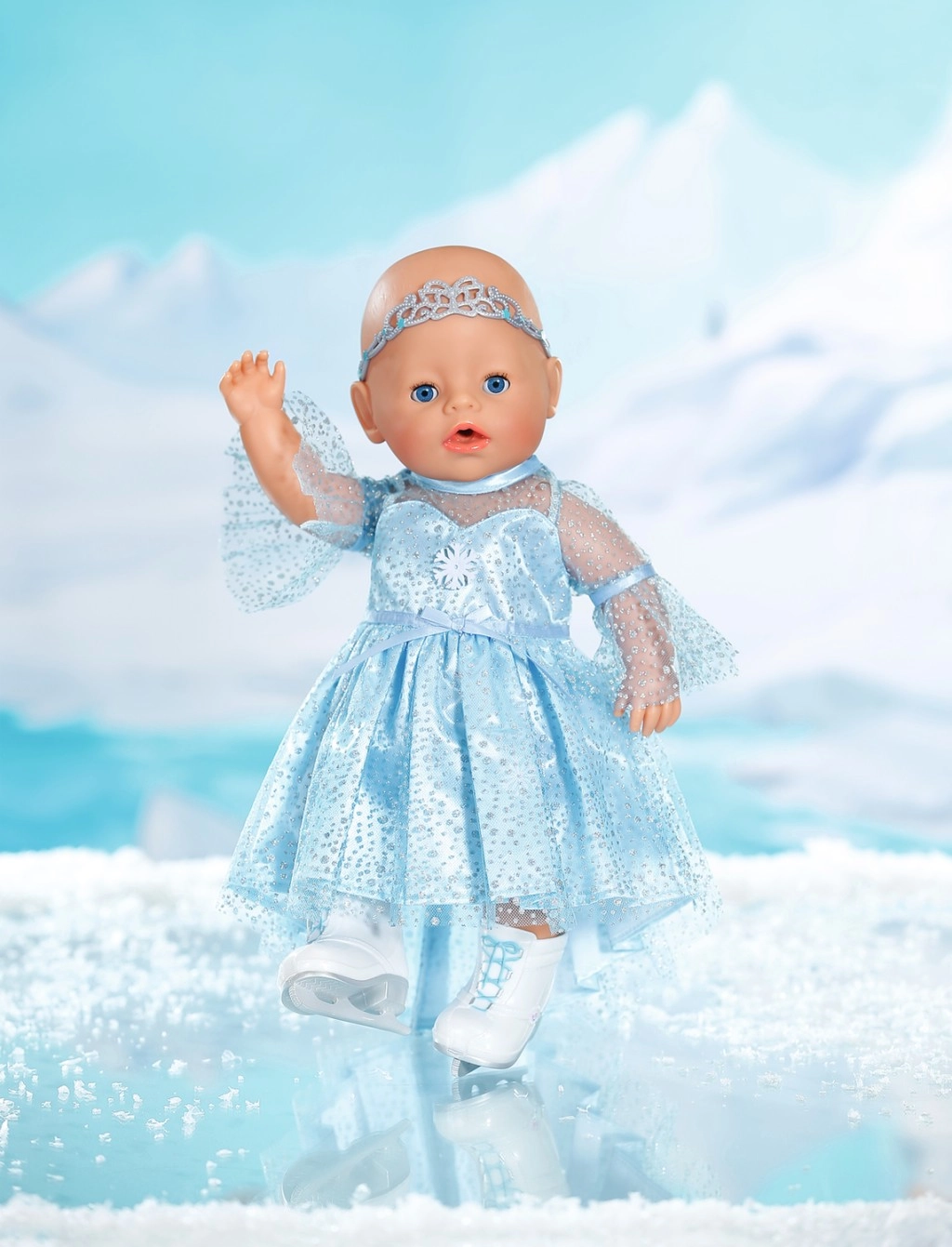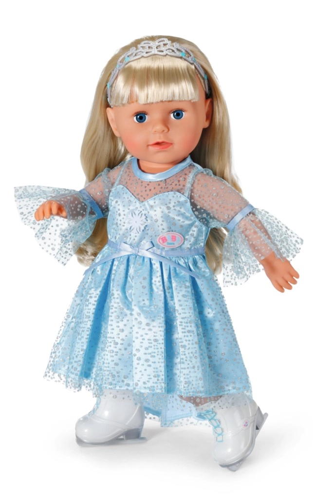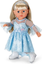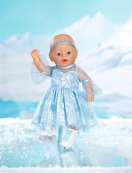 Elegants komplekts BABY born lellēm 43 cm ienes ikdienas spēlē ziemas karaļvalsts burvību. Gaisīga, mirdzoša kleita ar maigu pārsegu viegli uzvelkama, un pateicoties diadēmai frizūra turēsies pat katrā piruetē. Baltas kurpītes slidu stilā veicina iztēli un bērnu stāstus par daiļslidošanu.
