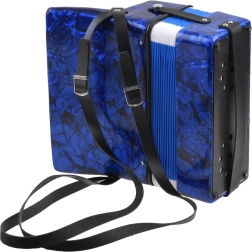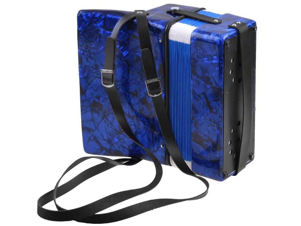 Spīdīgs zils korpuss ar marmora efektu, taustiņi un basu pogas. Akordeons skan tīri un patīkami – ideāli pirmajai muzikālajai pieredzei.