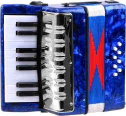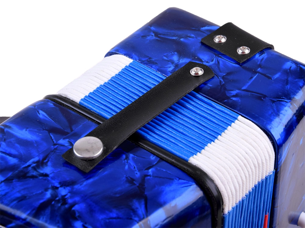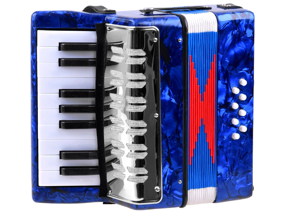 Realistisks izskats un funkcijas – bērnu akordeons izskatās un darbojas kā īsts instruments: skaņa rodas, izplešot un saspiežot mēchu, pieejami taustiņi un basu pogas. Pateicoties kvalitatīvam izpildījumam un spīdīgam zilam pārklājumam, tas ir pievilcīgs un izturīgs.