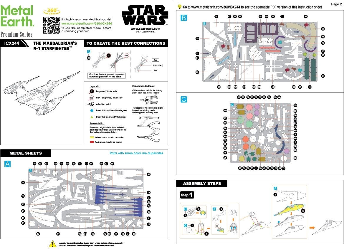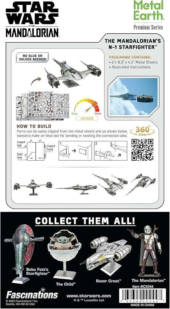 Šis premium komplekts ļauj MANDALORIAN faniem un modelētājiem uzbūvēt precīzu leģendārā N‑1 Starfighter repliku. No kvadrātveida tērauda loksnēm jūs izformēsiet un savienosiet detaļas iespaidīgā metāla modelī ar smalku lāzera gravējumu, kas uzticami atveido kuģa oriģinālo izskatu.