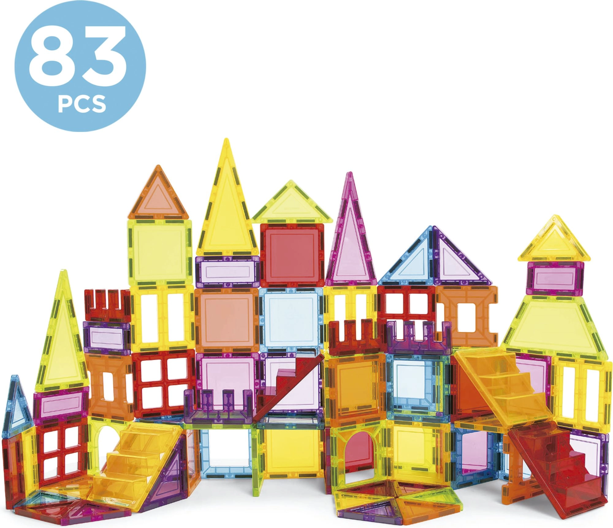 Komplektā ir 83 detaļas, ar kurām var izveidot daudzus trīsdimensiju būvējums pēc jūsu iecerēm.