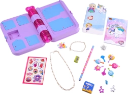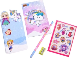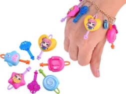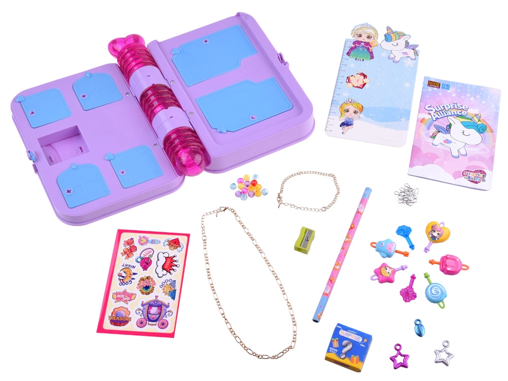 - 7 atslēdziņas; zīmulis; asināmais; ķēdīte; 2 piekariņi aprocēm; krāsainas krelles; aproces ķēdīte; dekors – salokāma sirsniņa; āķīši; piekariņi; uzlīmes; blociņš; kartona lineāls ar princesi; grāmatzīme ar vienradzi