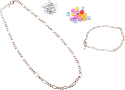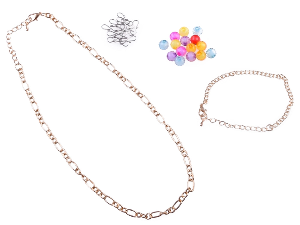 Komplektā ir pierakstu blociņš, uzlīmes, zīmulis un asināmais, kā arī krellītes, ķēdītes un piekariņi savu aproču veidošanai.