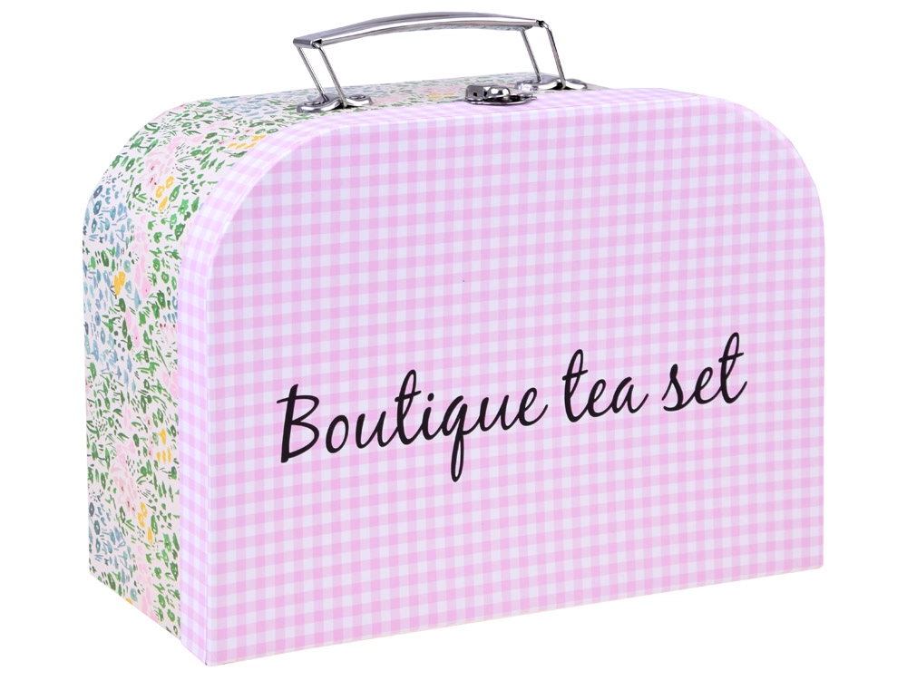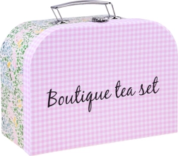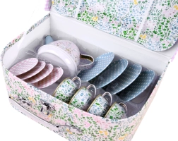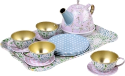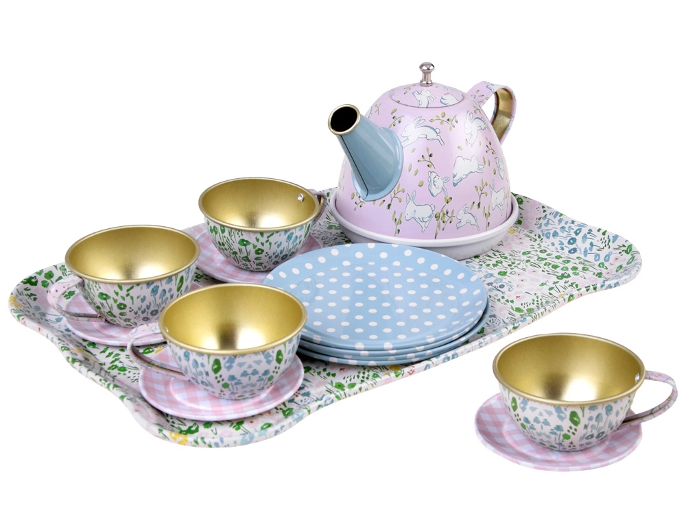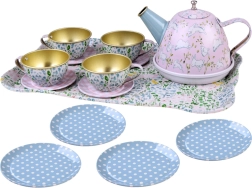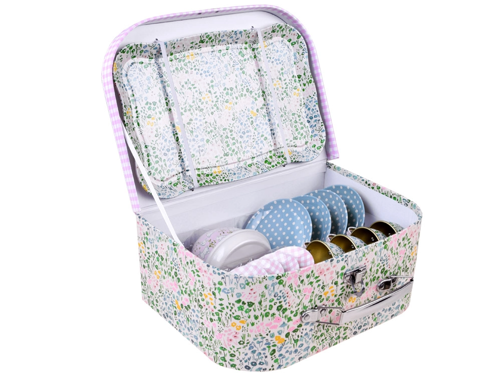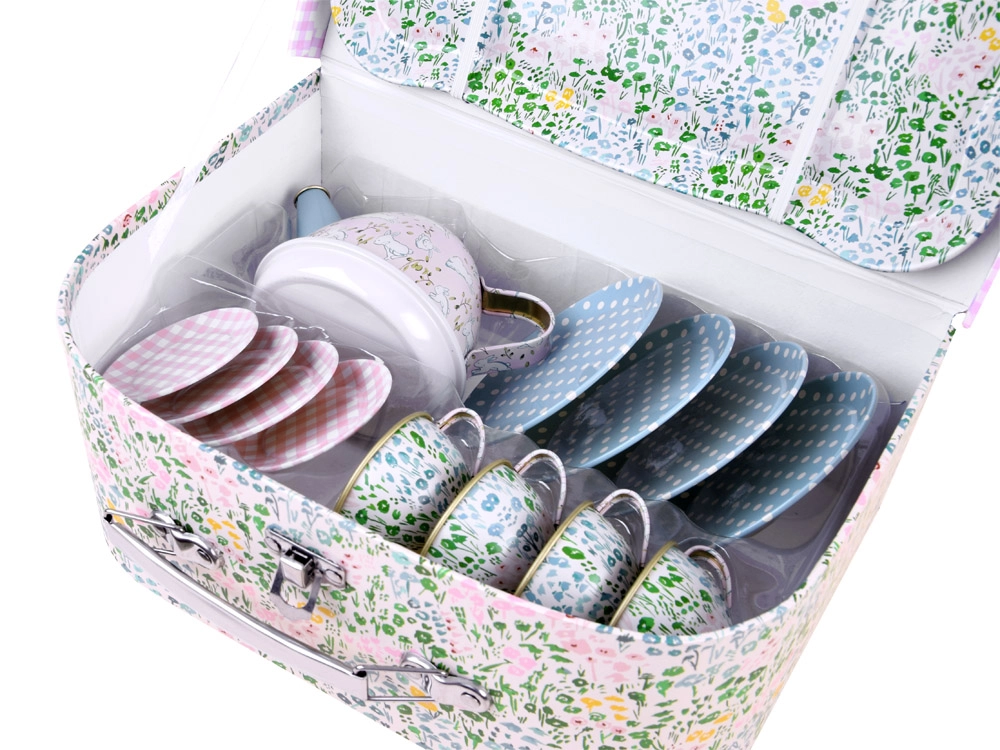 Burvīgs bērnu tējas komplekts ērtā čemodāniņā nodrošina stundām ilgu radošu spēli un lomu aktivitātes. Vieglie un izturīgie metāla trauki droši imitē īstu servīzi – ideāli tējas sarīkojumiem ar lellēm un mīkstajām rotaļlietām. Komplektā ietilpst tējkanna, paplāte, 4 tasītes ar apakštasītēm un 4 šķīvīši, lai bērni varētu pasniegt kā pieaugušie.