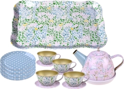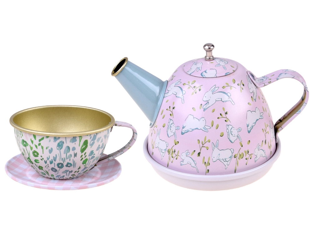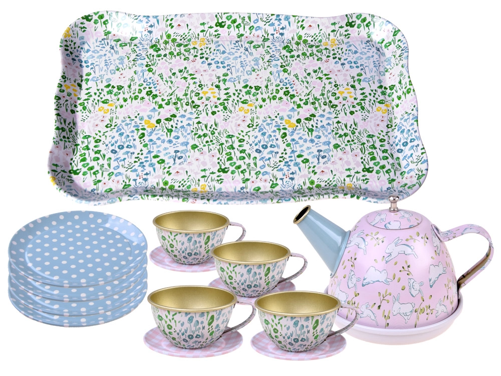 Paplāte, tējkanna, 4 tasītes ar apakštasītēm un 4 šķīvīši – viss saskaņots rotaļīgā dizainā priekam katrā tējas ballītē.