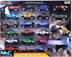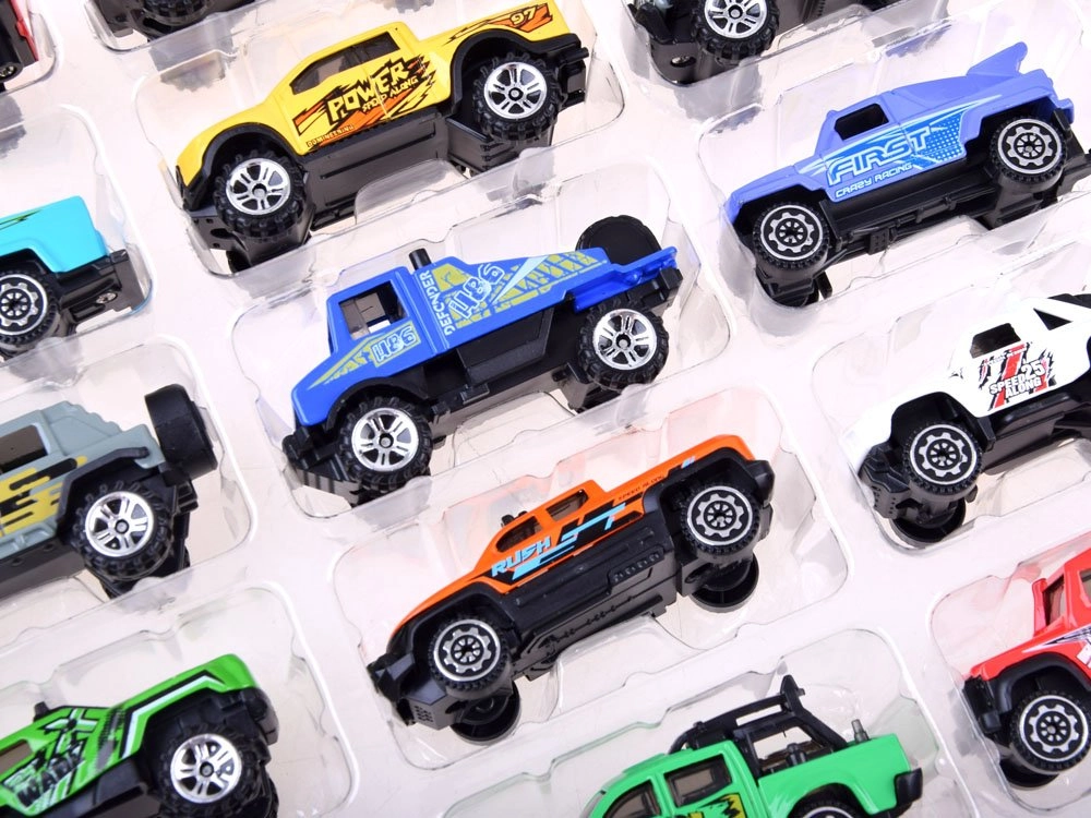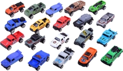 Lielais 20 metāla mašīniņu komplekts iepriecinās gan mazos kolekcionārus, gan sacīkšu cienītājus. Modeļiem ir metāla virsbūve uz plastmasas šasijas, tie ietver apvidus auto un pikapus ar detalizētu izstrādi un piesaistošu grafiku. Katrs modelis ir aptuveni 7,5–8 cm garš.